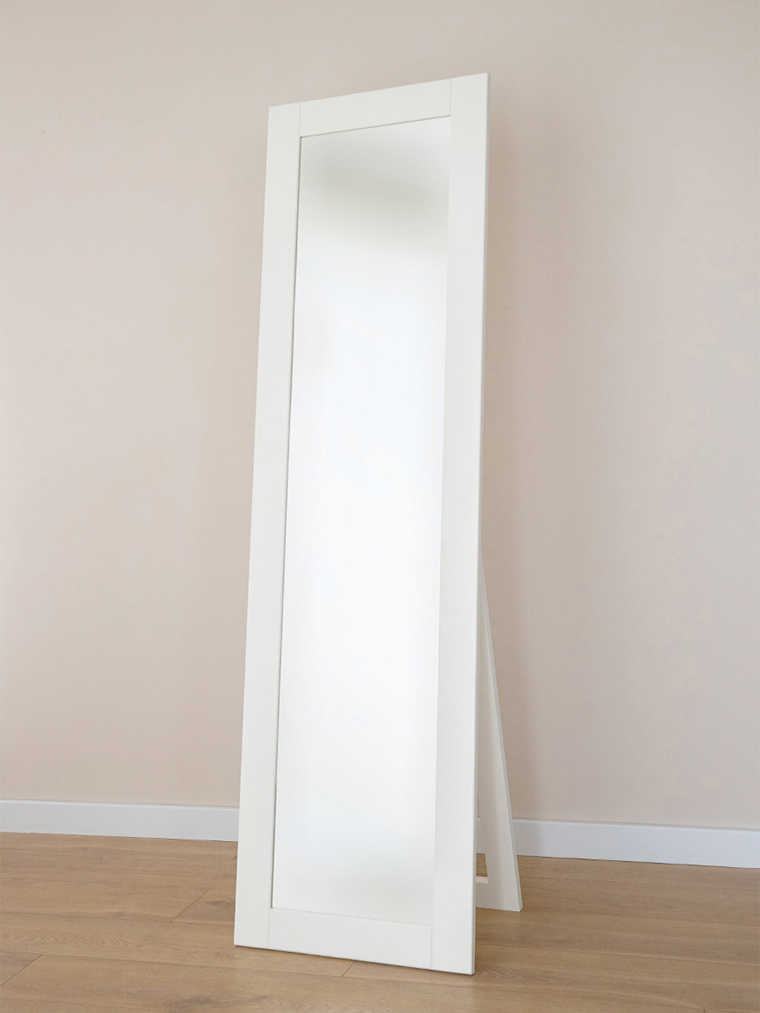 Lustro stojące białe Ingrid to esencja prostej elegancji. Wysokość 175 cm i szerokość 50 cm sprawiają, że znakomicie pracuje w codziennym użytkowaniu: od korytarza, przez garderobę i sypialnię, po butik lub studio. Uniwersalna forma bez zbędnych zdobień, do tego ponadczasowa biel RAL 9010 – razem tworzą duet, który subtelnie rozświetla przestrzeń, dodaje jej oddechu i wizualnie powiększa wnętrze.