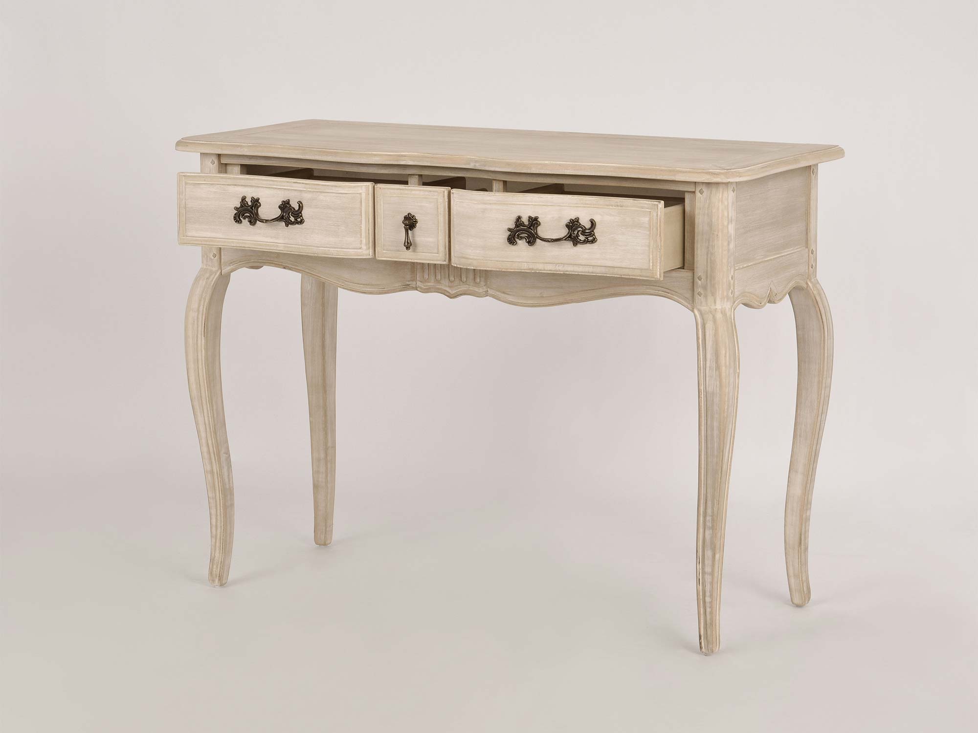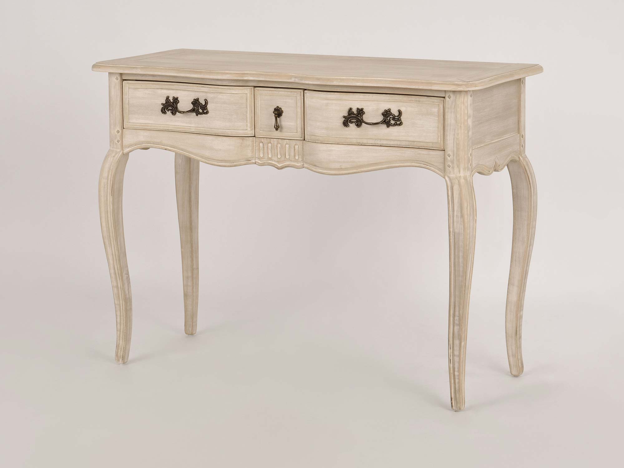 Konsola Sorrento White to elegancki mebel w stylu prowansalskim, który wprowadzi do Twojego wnętrza subtelną elegancję i ciepło. Wykonana z drewna paulowni, z bieloną powierzchnią i naturalnymi sękami, konsola prezentuje połączenie klasyki z nowoczesnością. Ciemnobrązowy, przecierany blat oraz rzeźbienia na froncie nadają jej wyjątkowego charakteru. Metalowe uchwyty i gięte nóżki wprowadzają nowoczesny akcent, czyniąc mebel eleganckim i funkcjonalnym. Idealna do salonu, przedpokoju lub sypialni, konsola Sorrento White łączy estetykę z praktycznością, oferując przestronność i urok w jednym.