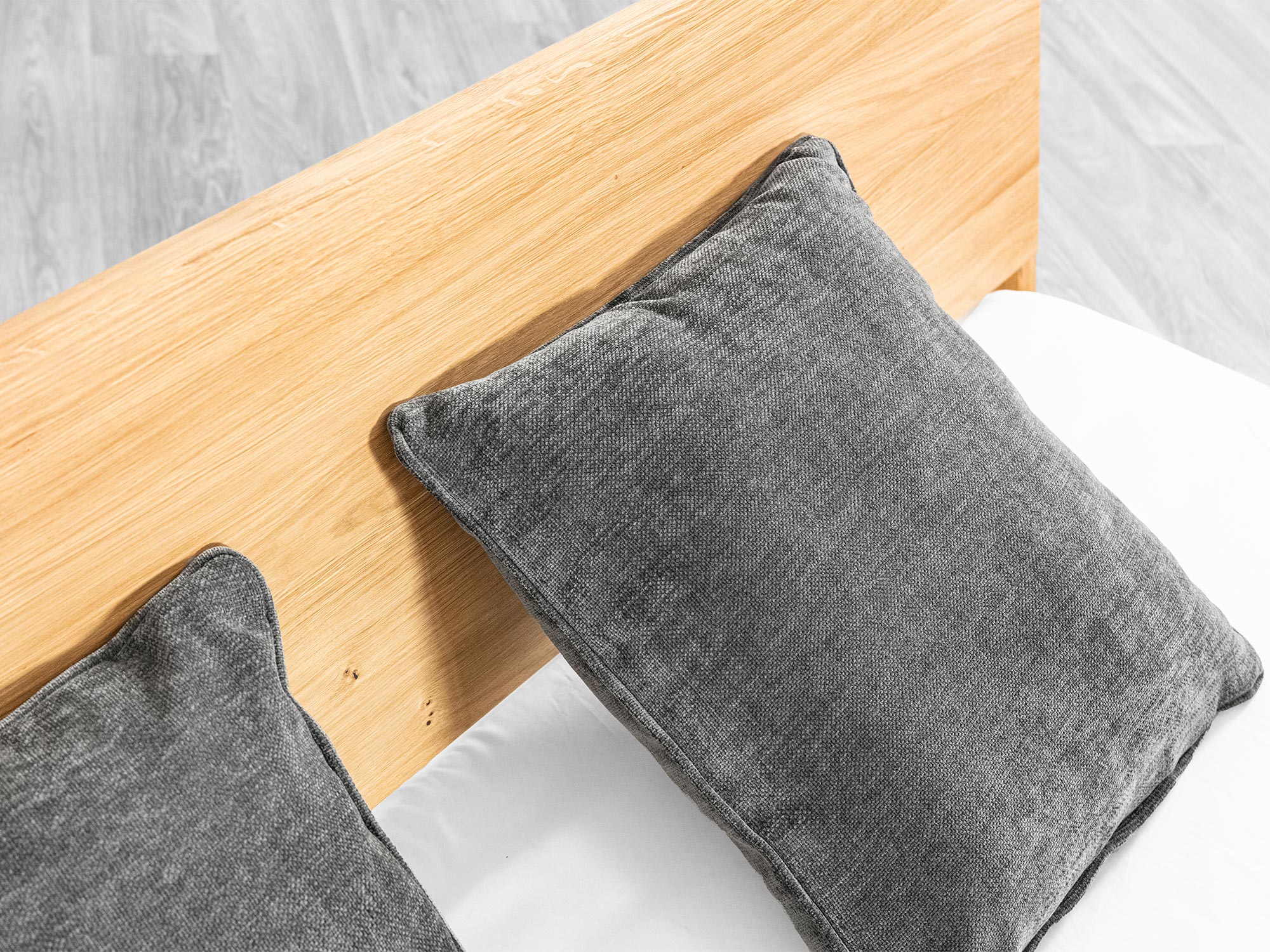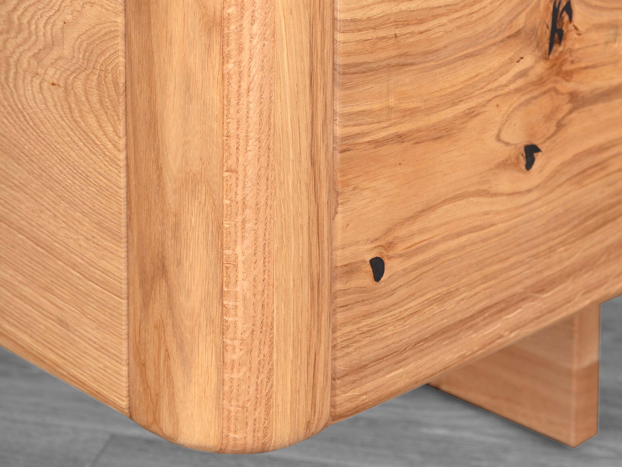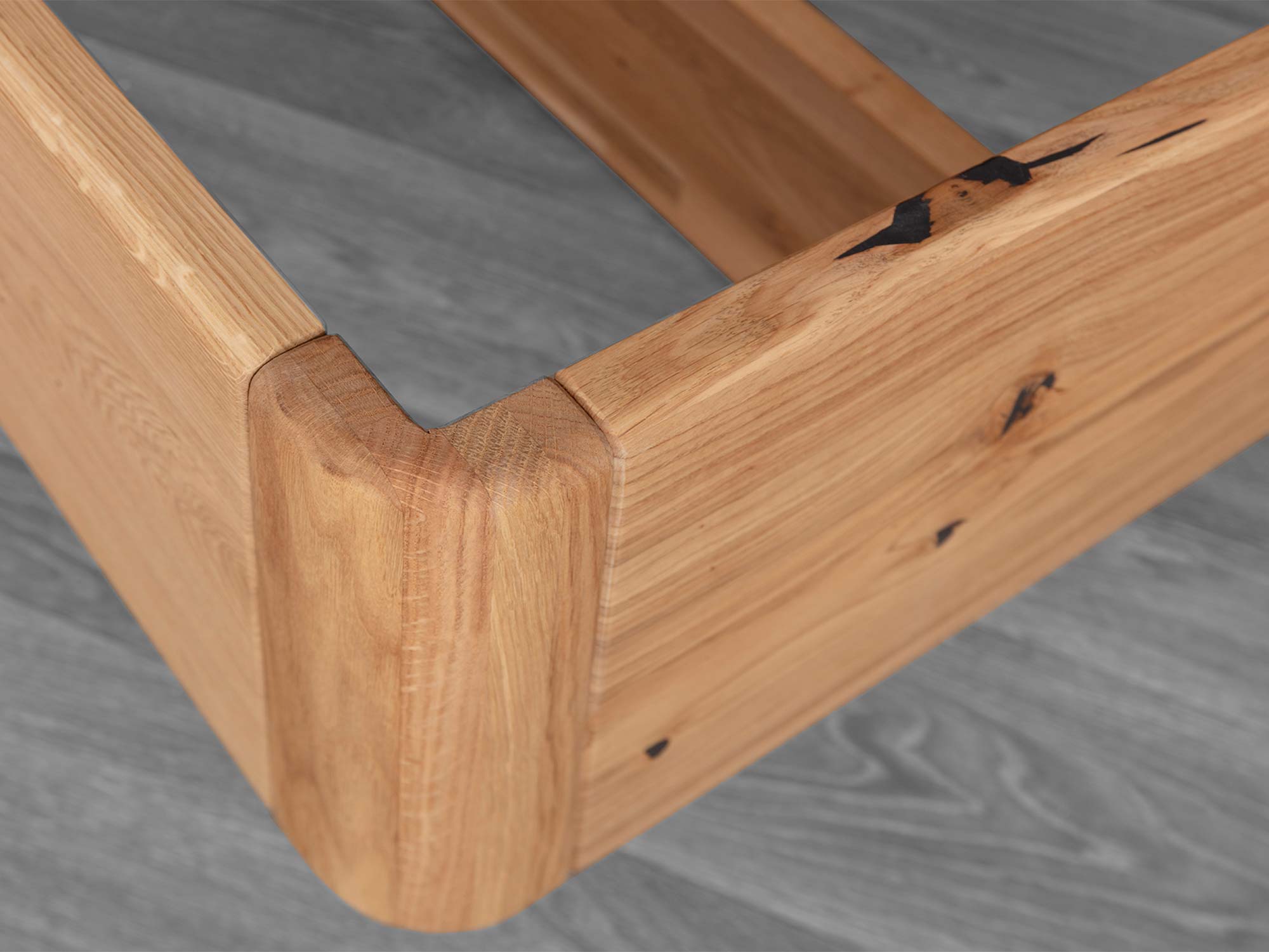 Zaokrąglona rama łączy nowoczesną prostotę z organiczną miękkością. Zaoblone narożniki zwiększają bezpieczeństwo użytkowania, a subtelnie wyoblone krawędzie sprawiają, że łóżko wygląda lekko nawet przy masywnej, dębowej konstrukcji. To detal, który czuć w dotyku i widać w każdym ujęciu.