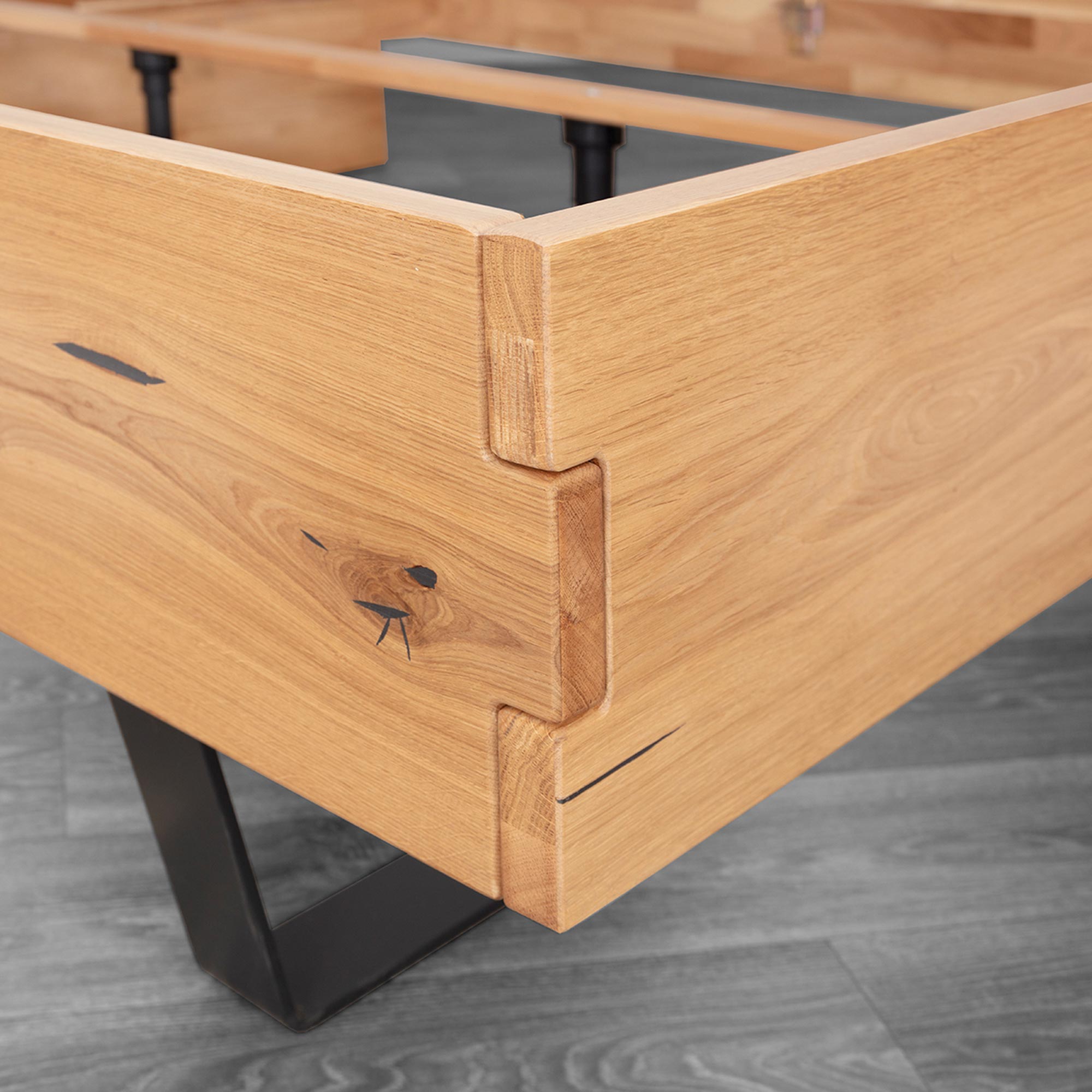 Na wewnętrznej stronie ramy (od strony materaca) mogą wystąpić większe obszary pokryte czarną szpachlą.  Nie wpływa to jednak na estetykę mebla, gdyż element ten pozostaje niewidoczny podczas użytkowania. To naturalny efekt pracy z drewnem dębowym, który podkreśla jego autentyczny charakter.