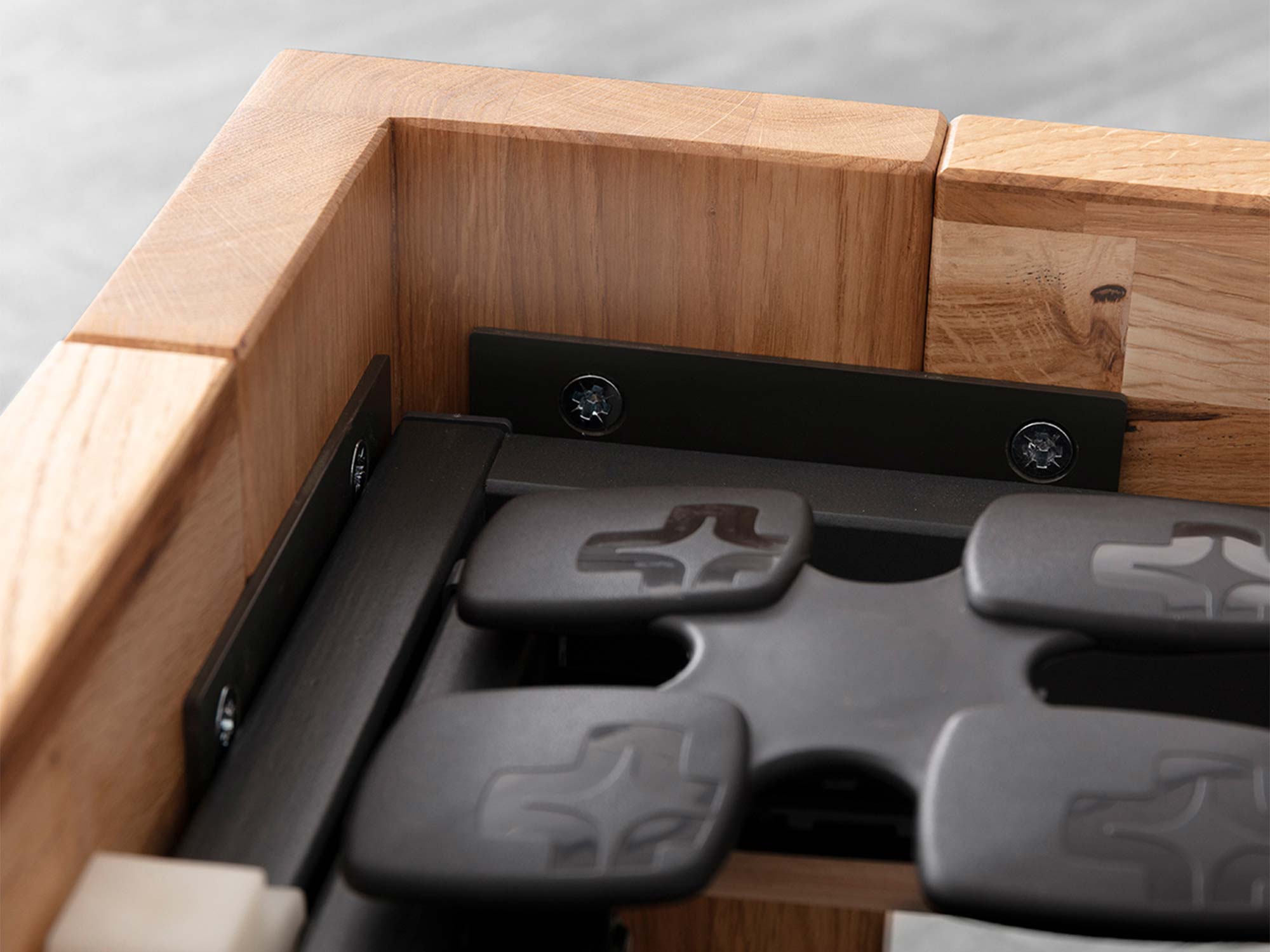 Konstrukcja pod komfort. Przemyślany układ punktów podparcia i precyzyjne okucia zapewniają sztywność i cichą pracę łóżka. Głębokość osadzenia materaca i ranty ramy zaprojektowano tak, aby materac nie przesuwał się podczas snu.