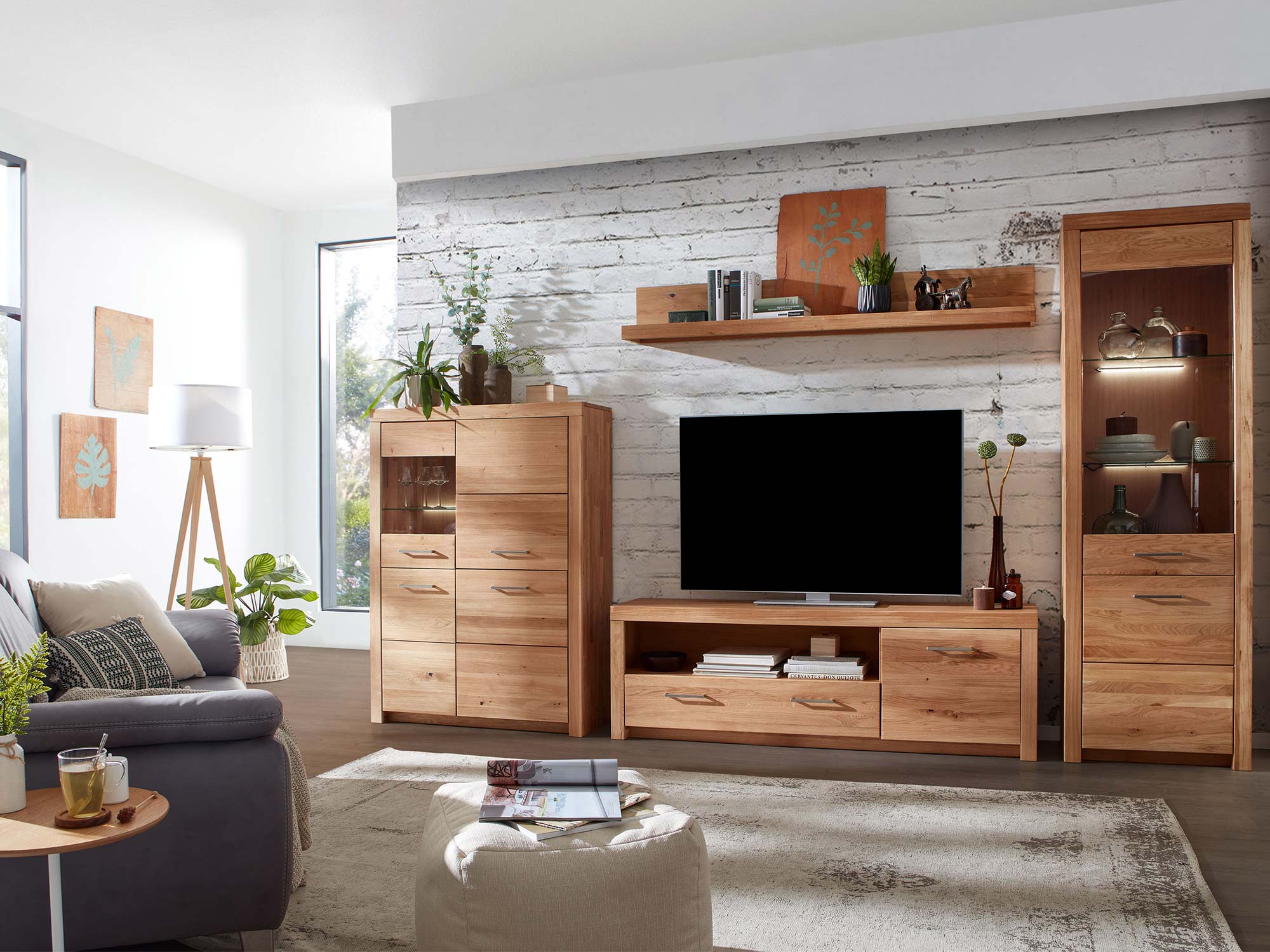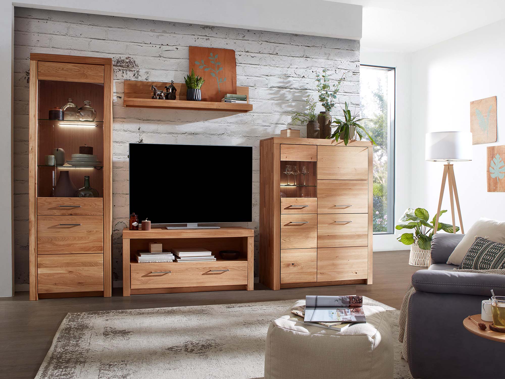 Aranżacja salonu z meblami z litego drewna dębowego i oświetleniem