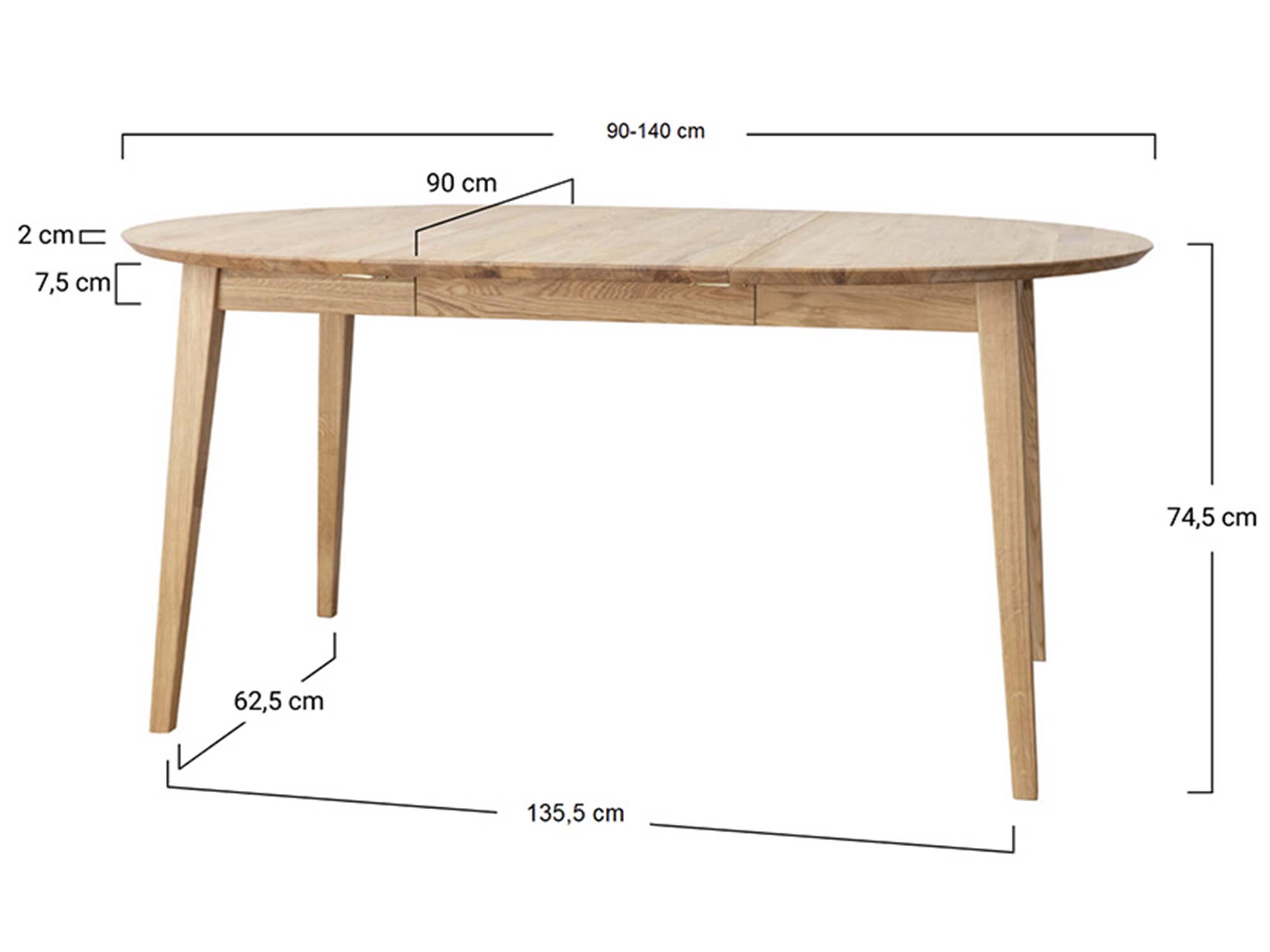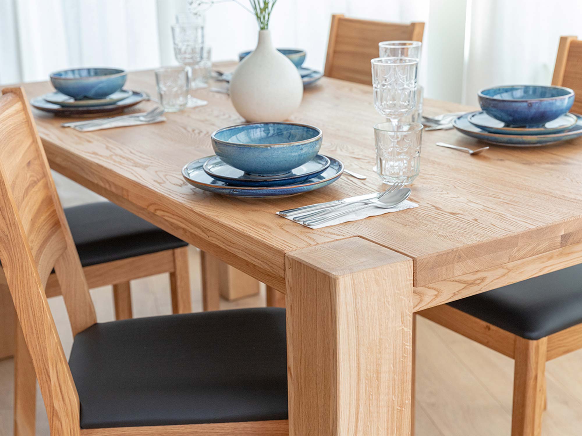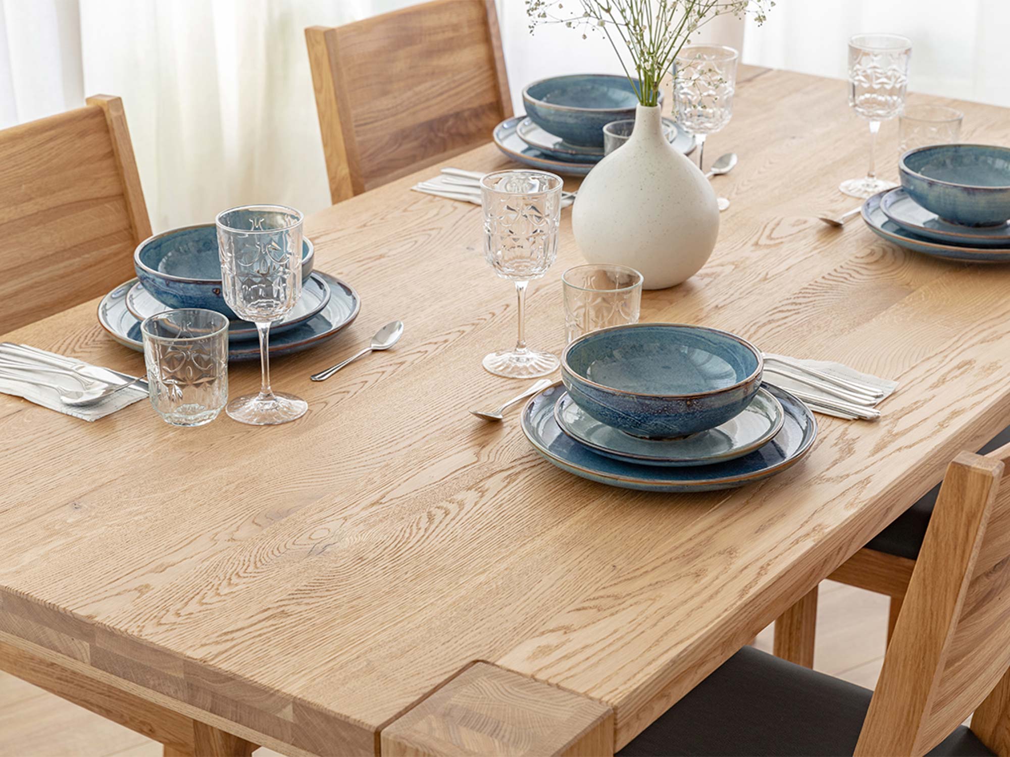Naturalny dąb to materiał, który od wieków symbolizuje trwałość i elegancję. Olejowana powierzchnia blatu podkreśla usłojenie, chroniąc jednocześnie przed zabrudzeniami i drobnymi uszkodzeniami. Każdy egzemplarz ma unikatowy rysunek drewna – nie ma dwóch identycznych stołów, co nadaje każdemu wnętrzu indywidualny charakter.
