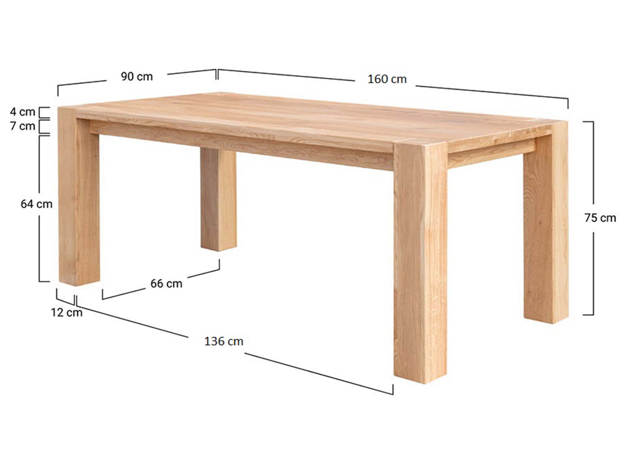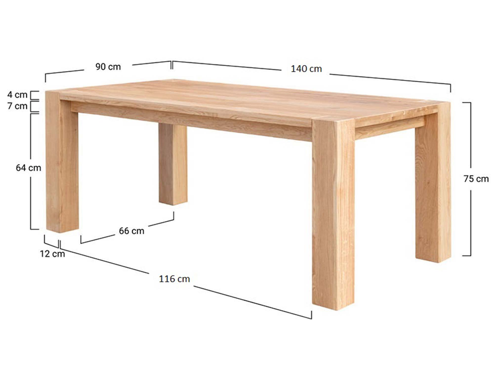 Model Siena wykonano z litego drewna dębowego, cenionego w stolarstwie za wytrzymałość, gęstość i stabilność. Blat ma imponującą grubość 4 cm (2+2 cm) – to czuć pod dłonią i… w spokoju ducha, bo tak masywna płyta nie boi się intensywnego użytkowania. Nogi osadzone na zewnątrz blatu nie tylko podbijają design, ale i zwiększają komfort siedzenia – łatwiej wsunąć krzesła i wygodniej rozsiąść się przy dłuższych bokach. Wymiary 160×90 cm dają swobodę dla 6 osób (a w razie potrzeby nawet 8), zachowując świetne proporcje do średniej wielkości jadalni.