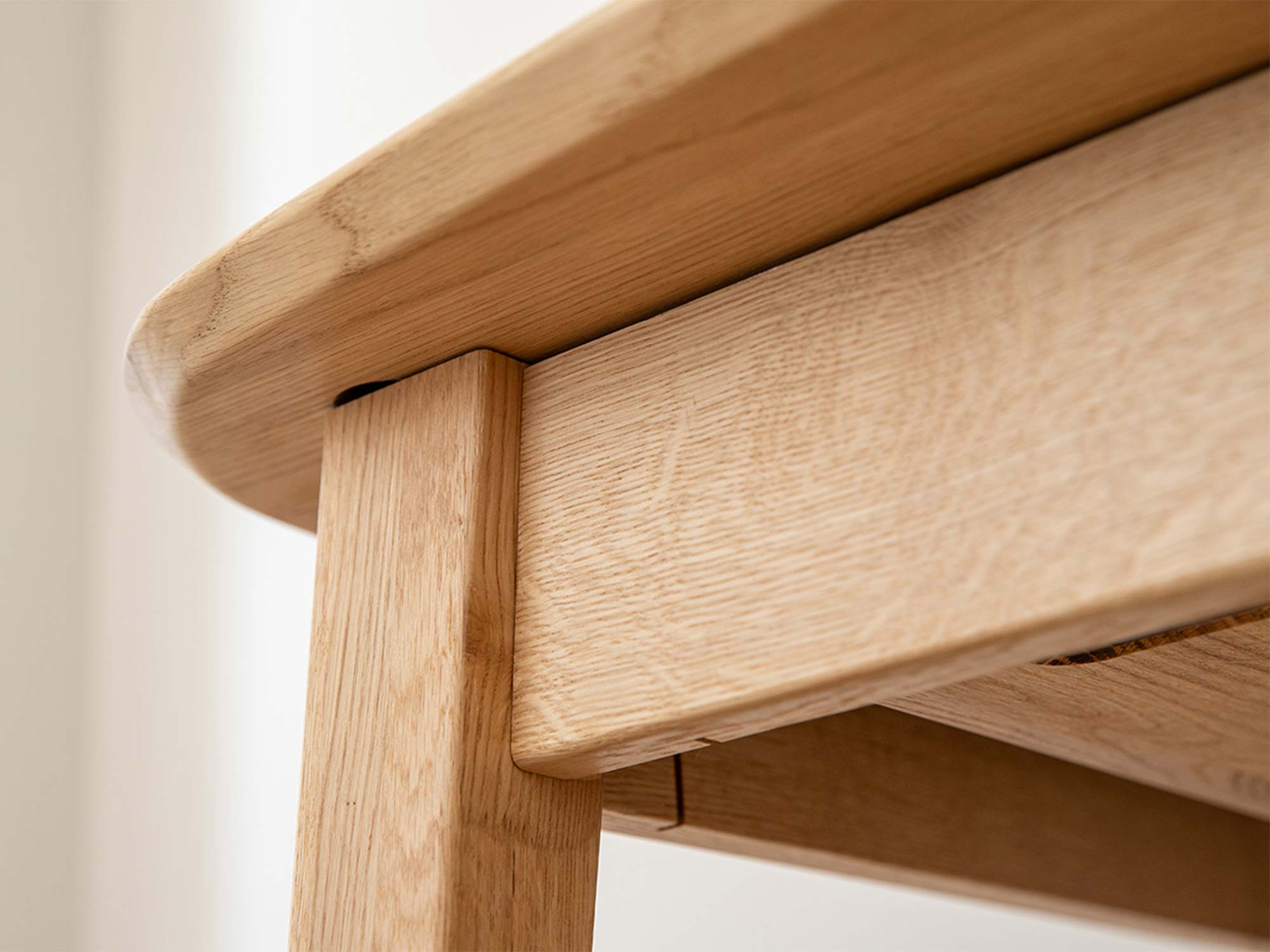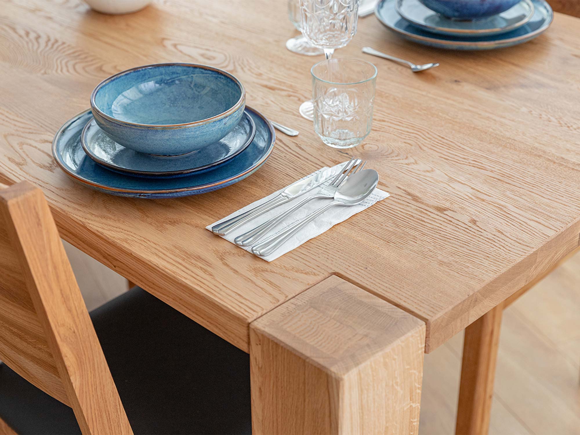 Całość wykonano z naturalnego drewna dębowego, które od wieków uznawane jest za symbol trwałości i solidności. Olejowane wykończenie nie tylko chroni blat przed codziennymi zabrudzeniami, ale również pięknie podkreśla naturalne usłojenie drewna. Z czasem stół nabiera charakteru – słoje i sęki stają się bardziej wyraziste, tworząc niepowtarzalną historię wpisaną w strukturę mebla.