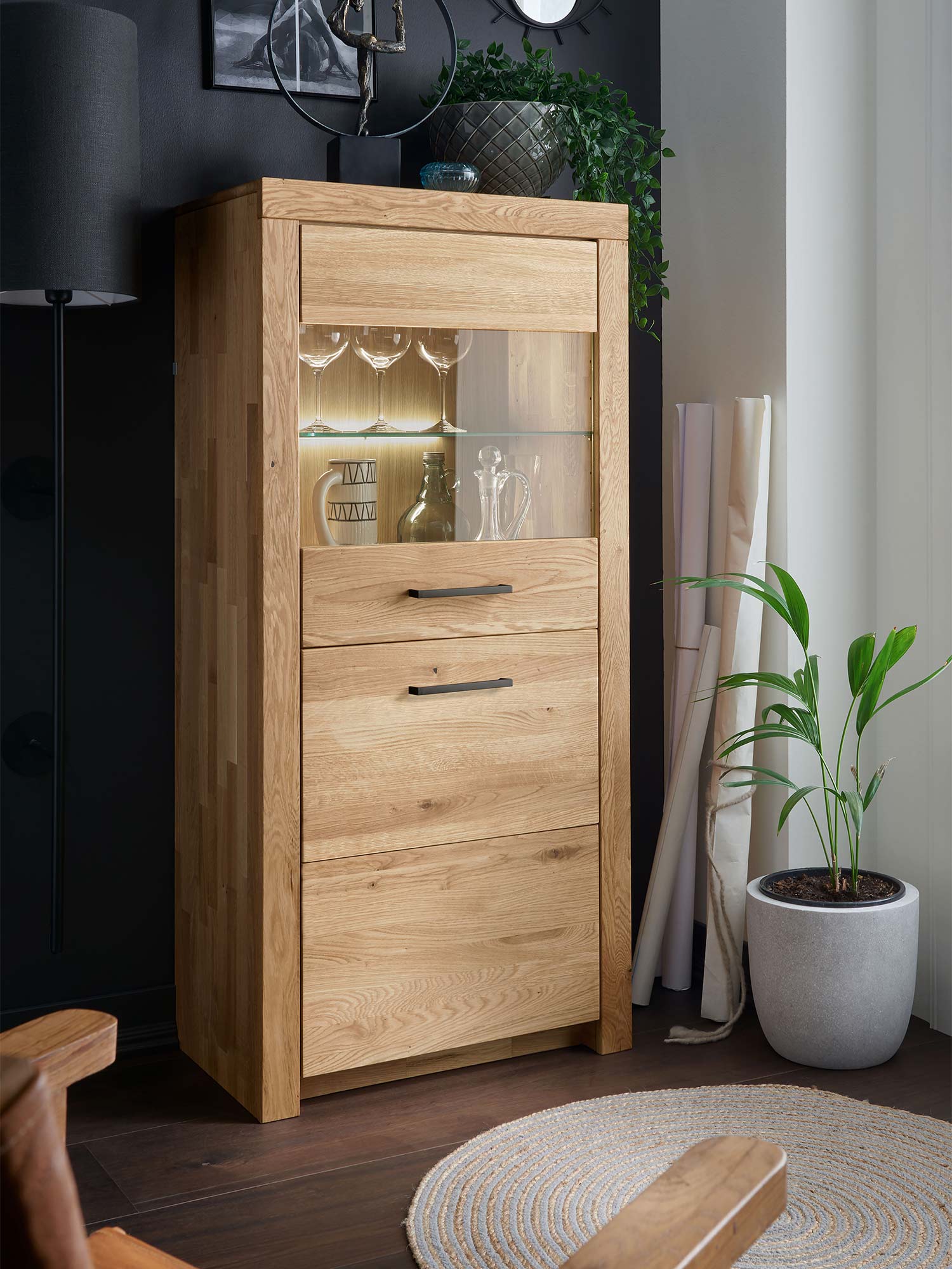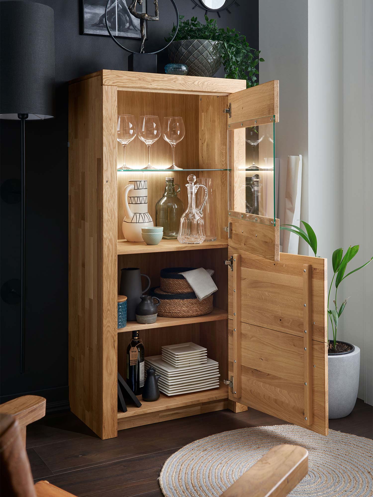 Szafka drewniana z witryną i oświetleniem LED w jasnym wnętrzu z wymiarami