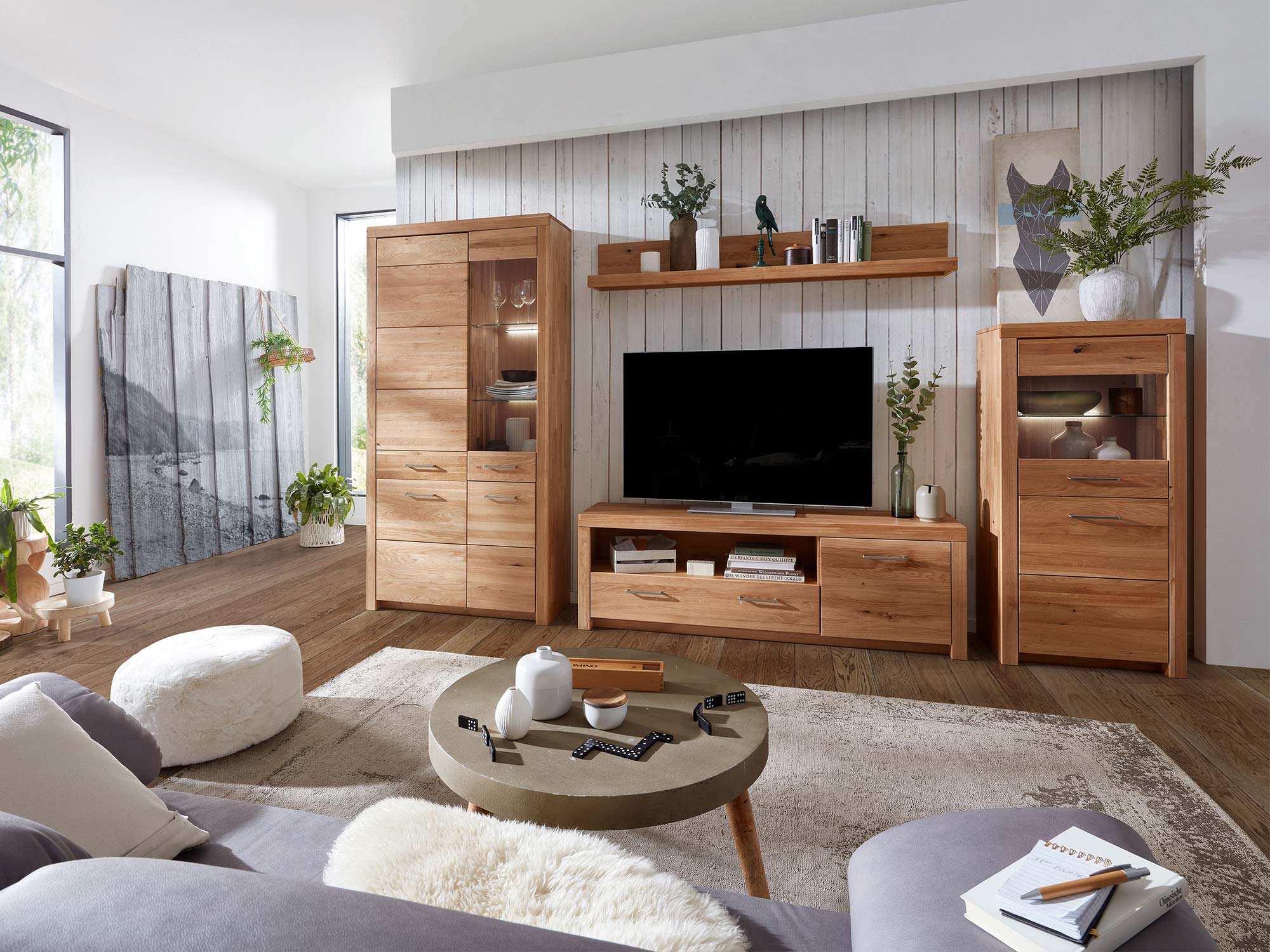 Aranżacja salonu z dębowymi meblami i jasną sofą