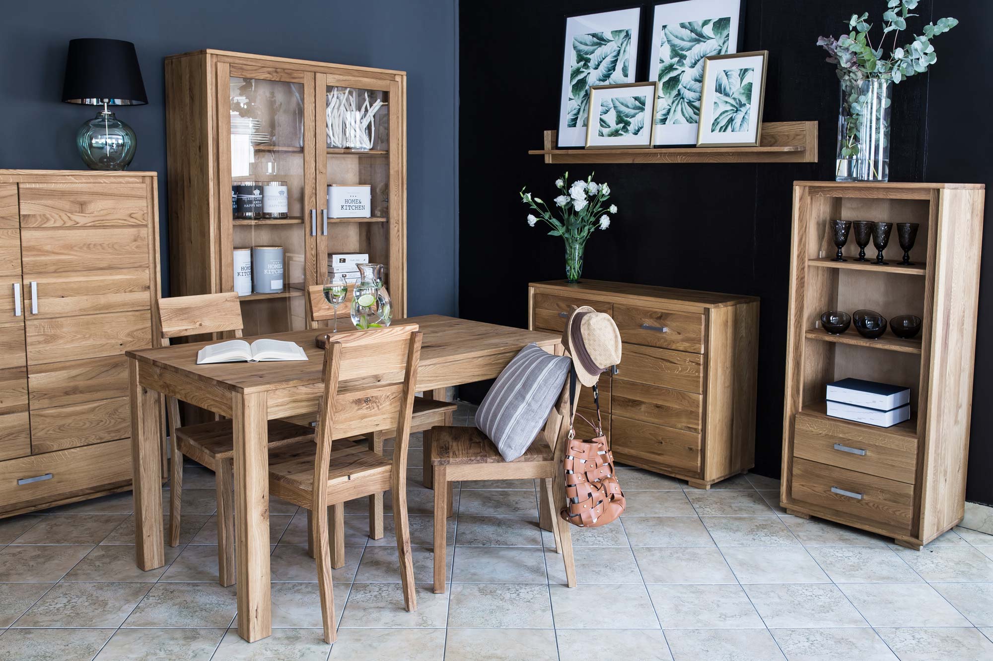 Prezentowany model wyróżnia się masywną konstrukcją, która jest wizytówką całej serii ALAMOS. Wykorzystanie litego dębu sprawia, że każda bryła posiada niepowtarzalny charakter, wynikający z naturalnego rozmieszczenia sęków i unikalnej struktury drewna. Powierzchnia mebla została starannie wykończona olejem, co nie tylko podkreśla głębię koloru, ale również chroni surowiec przed czynnikami zewnętrznymi.