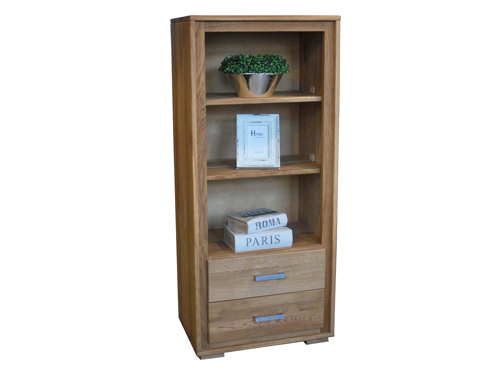 Mebel ten został zaprojektowany z myślą o maksymalnej użyteczności przy zachowaniu eleganckiej formy. Otwarte półki stanowią doskonałe miejsce na ekspozycję książek lub dekoracji, natomiast dwie dolne szuflady pozwalają na uporządkowanie drobniejszych przedmiotów. Dzięki prostej, a zarazem szlachetnej stylistyce, regał ten wprowadza do wnętrza atmosferę przytulności i harmonii z naturą.