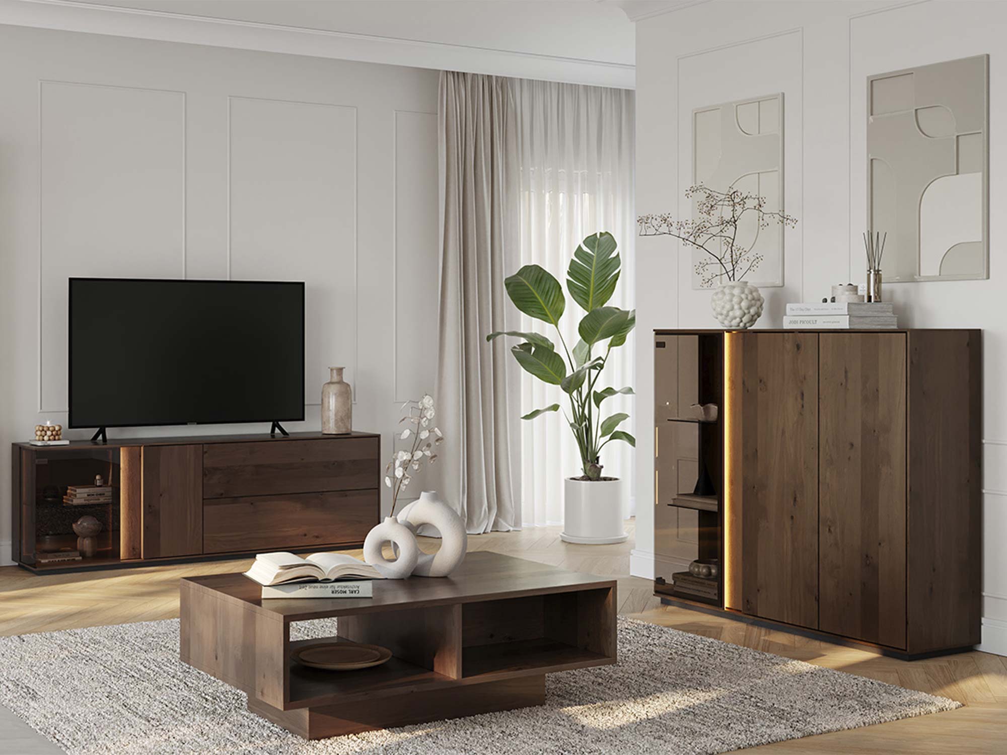 Szafka została zaprojektowana z myślą o komforcie użytkowania, dlatego zrezygnowano w niej z tradycyjnych uchwytów na rzecz intuicyjnego systemu Tip-On. Wnętrze mebla kryje cztery zamykane szafki oraz dwie półki, co zapewnia dużą ilość miejsca na sprzęt RTV, kolekcję płyt czy akcesoria. Przeszklone elementy frontów w połączeniu z fabrycznym oświetleniem LED pozwalają na efektowną ekspozycję dekoracji, nadając całemu pomieszczeniu nowoczesnego charakteru.