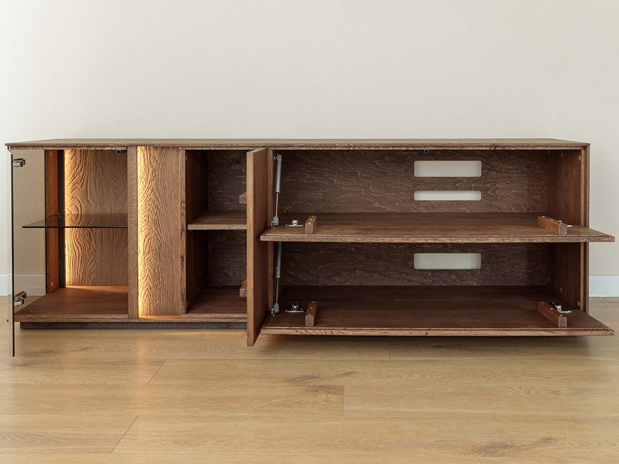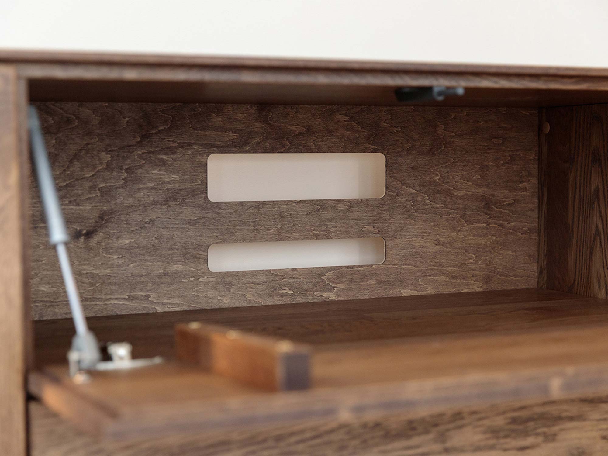 Wnętrze komody tabacco z otworami na kable i siłownikiem klapy