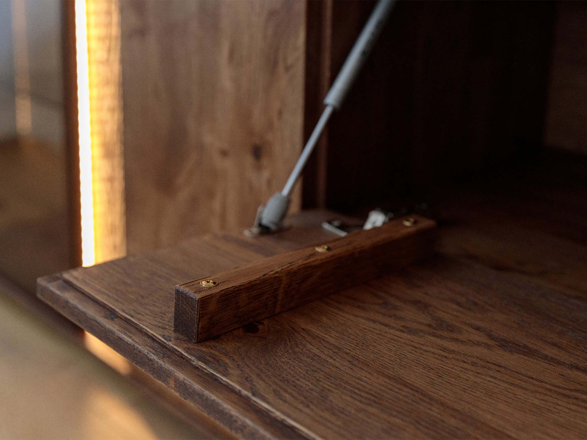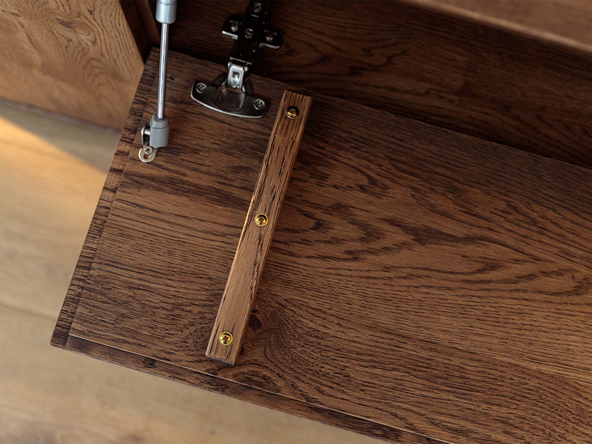 Detal klapy komody tabacco z drewnianym uchwytem zawiasem i siłownikiem