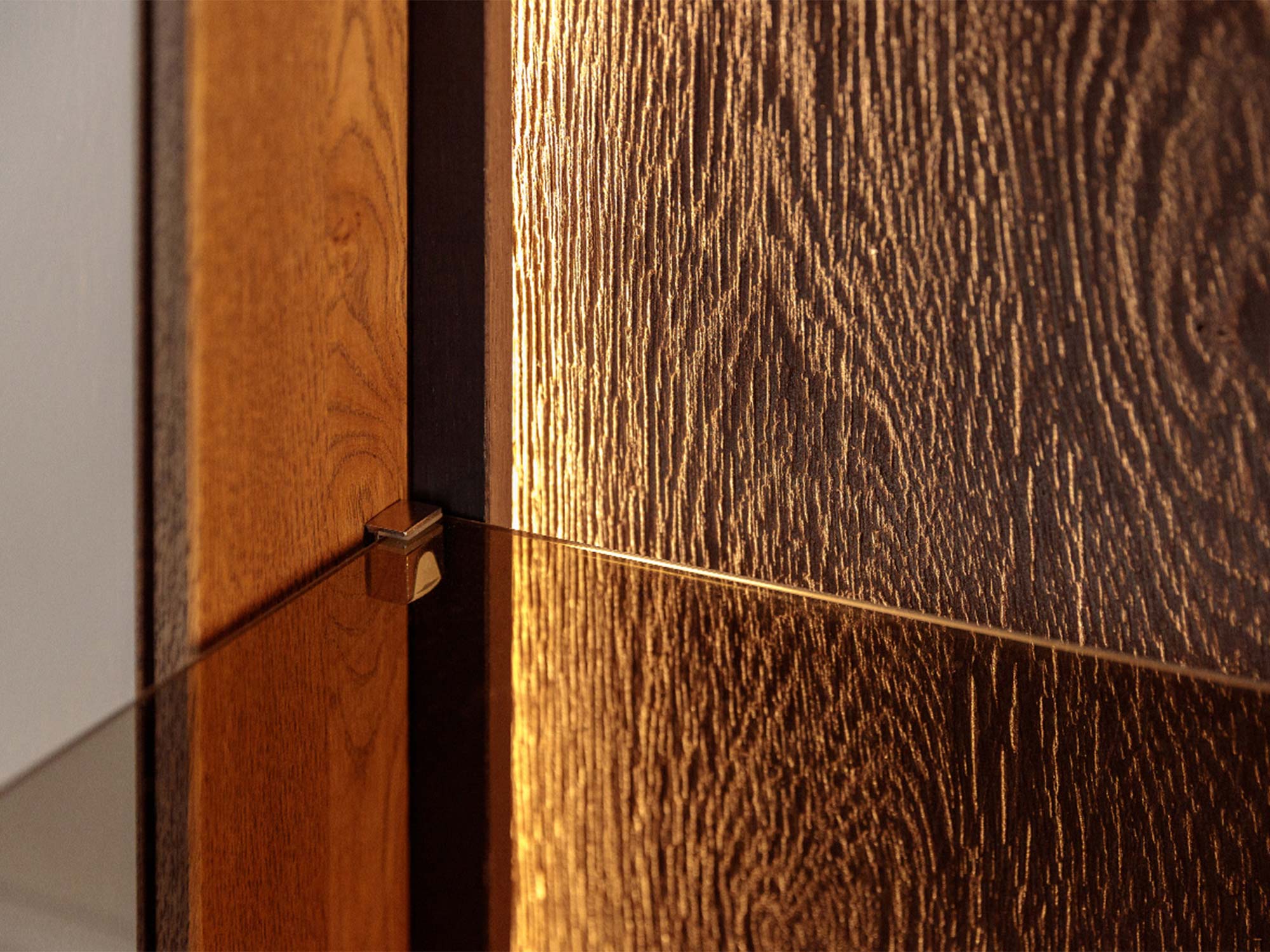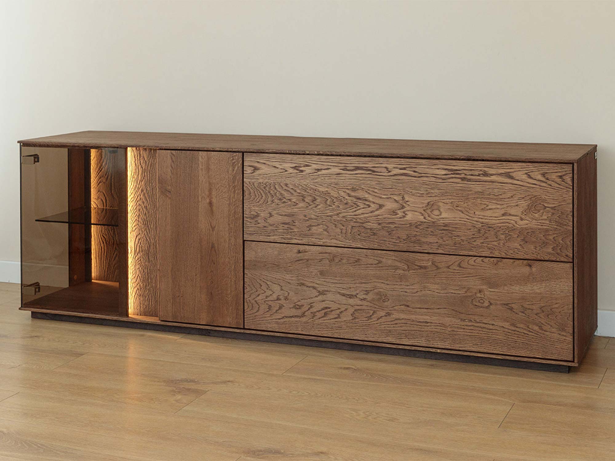 Detal podświetlenia LED i drzwi dębowych komody tabacco zbliżenie