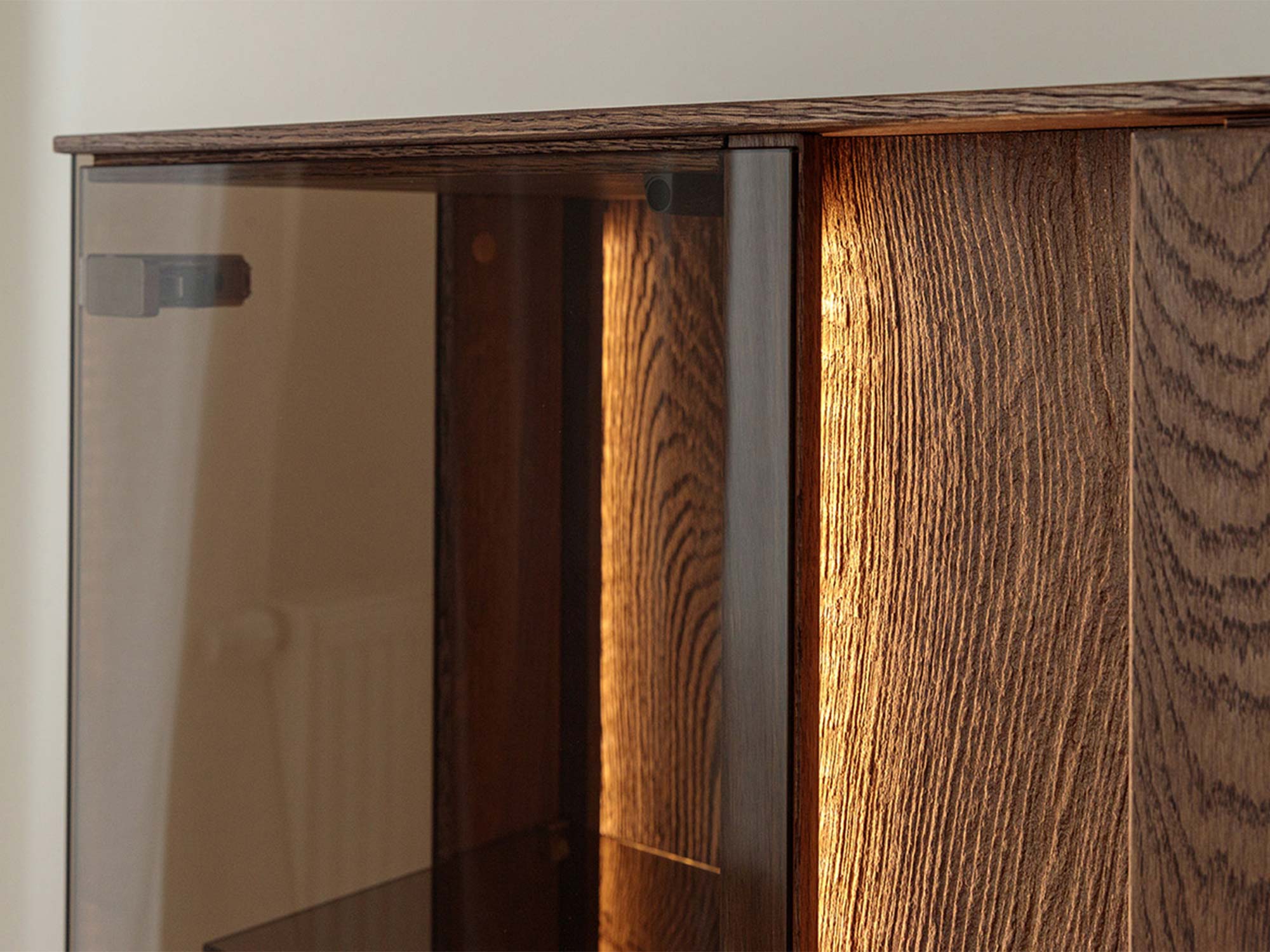 Detal witrynki szklanej komody tabacco z podświetleniem LED i usłojeniem