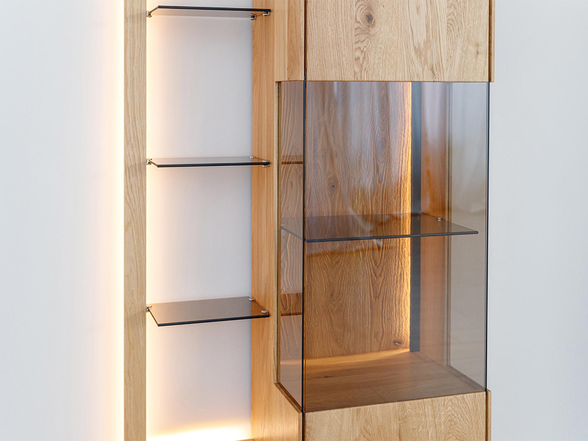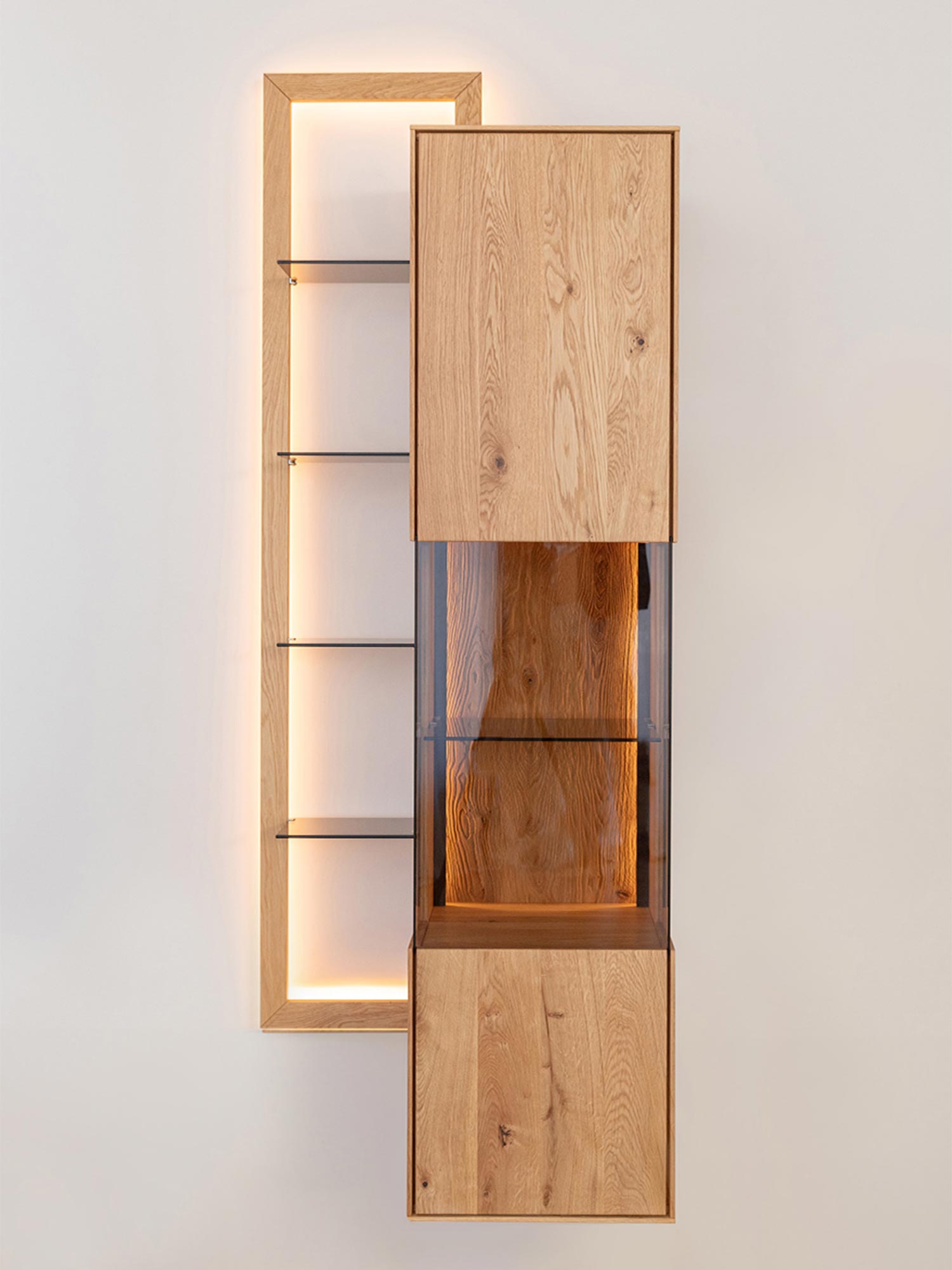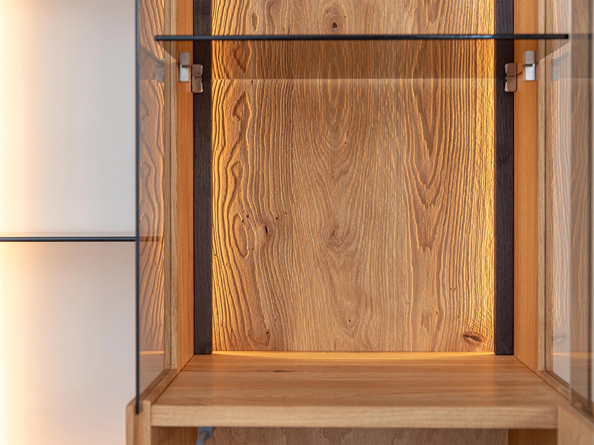 Nowoczesna Witryna z Regałem Essentia to mebel, który emanuje prostotą i nowoczesnością, wprowadzając powiew świeżości do każdego wnętrza. Wykonana z litego dzikiego dębu, ta zjawiskowa witryna łączy w sobie minimalistyczny design oraz funkcjonalność, odzwierciedlając współczesne podejście do aranżacji przestrzeni. Jej elegancki wygląd i praktyczne rozwiązania sprawiają, że doskonale wpisuje się w różnorodne style wnętrz.