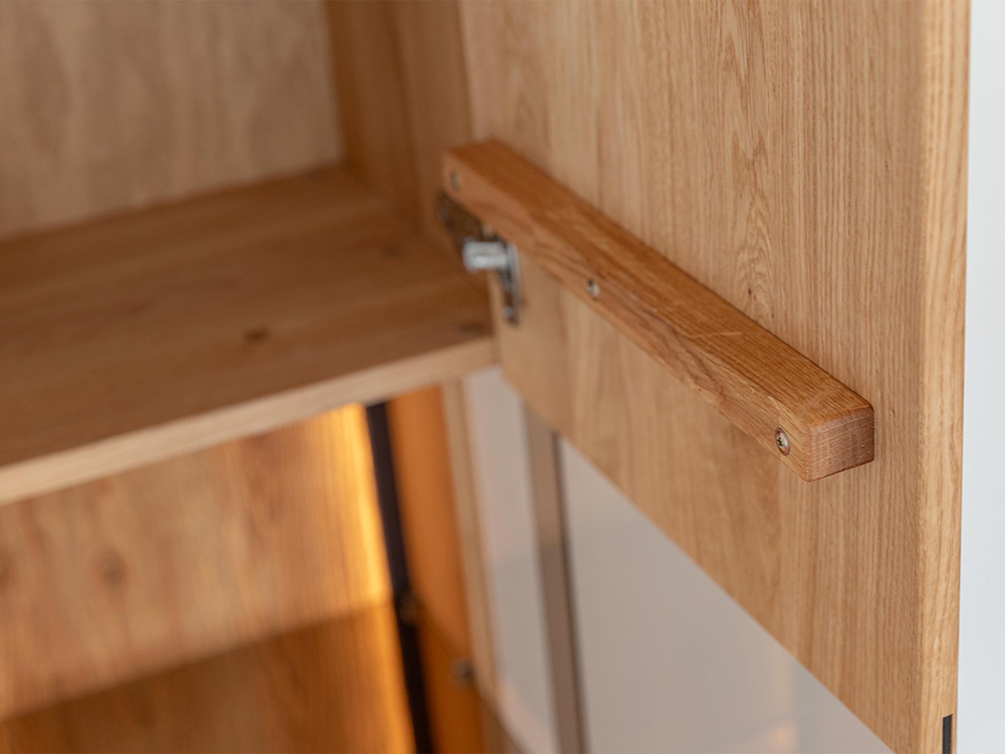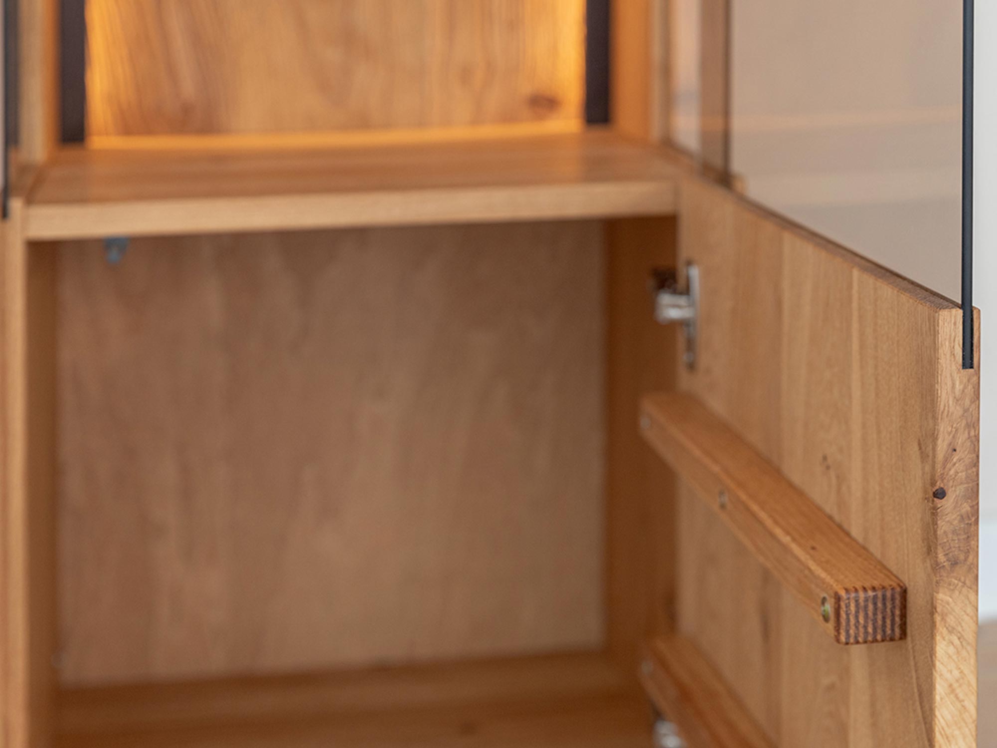 Nowoczesna Witryna z Regałem Essentia to inwestycja w piękno i funkcjonalność Twojego wnętrza. Jej solidna konstrukcja, staranne wykończenie oraz przemyślany design sprawiają, że jest to mebel na lata, który będzie cieszyć oczy i służyć kolejnym pokoleniom. Wybierając witrynę z litego dzikiego dębu, inwestujesz w jakość, trwałość i elegancję, które przetrwają próbę czasu.