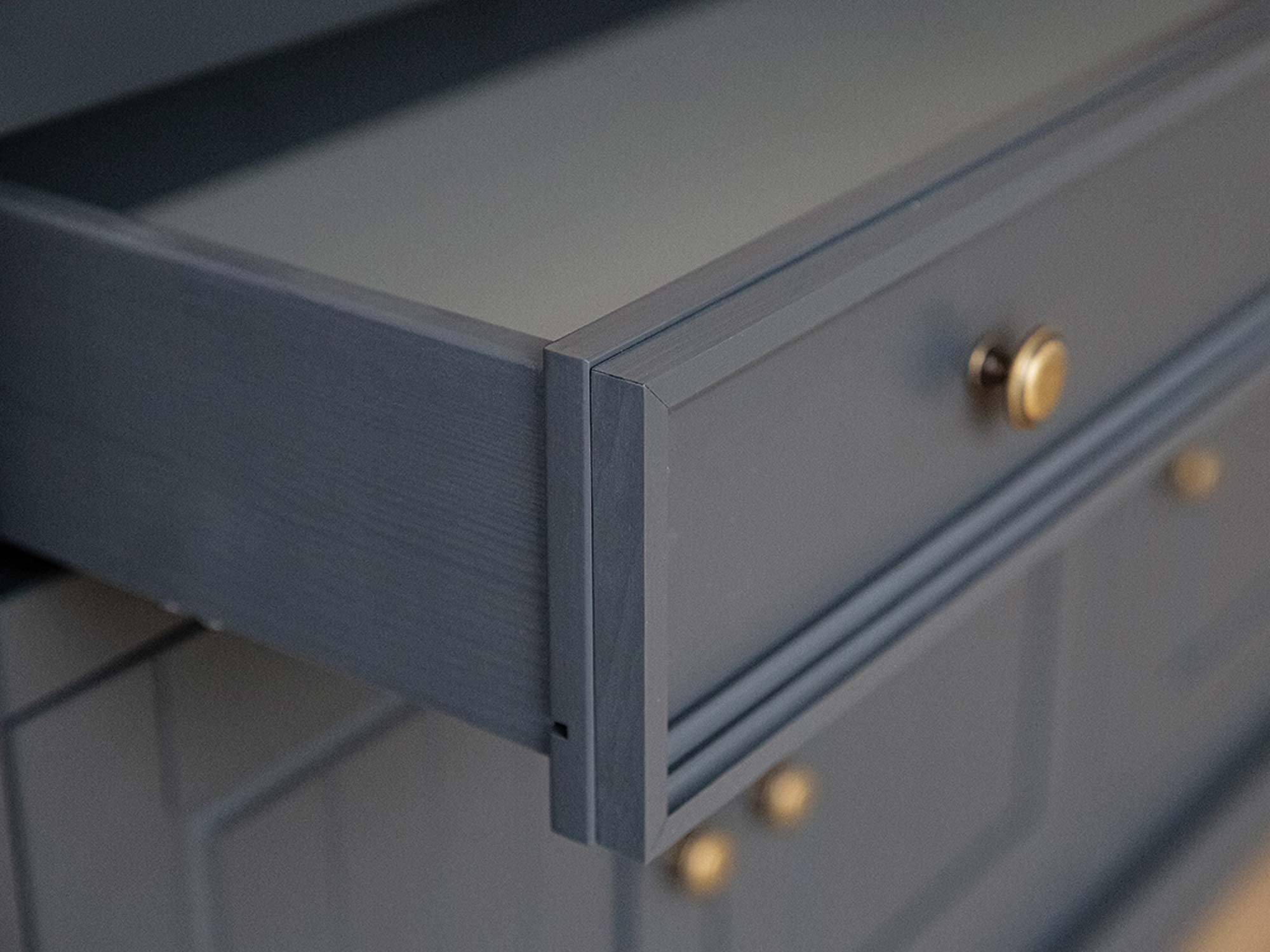 Biała klasyczna komoda drewniana grafit dąb zbliżenie szuflady INGRID