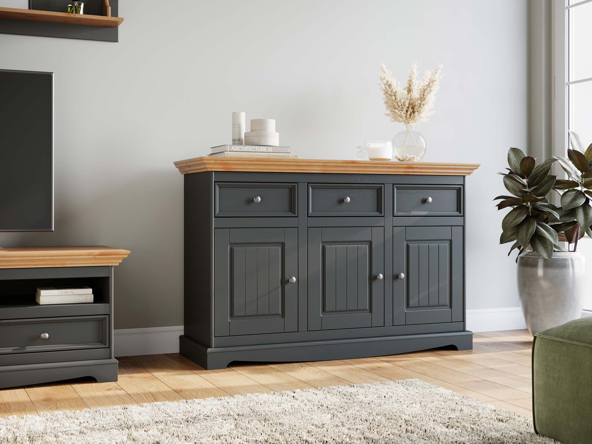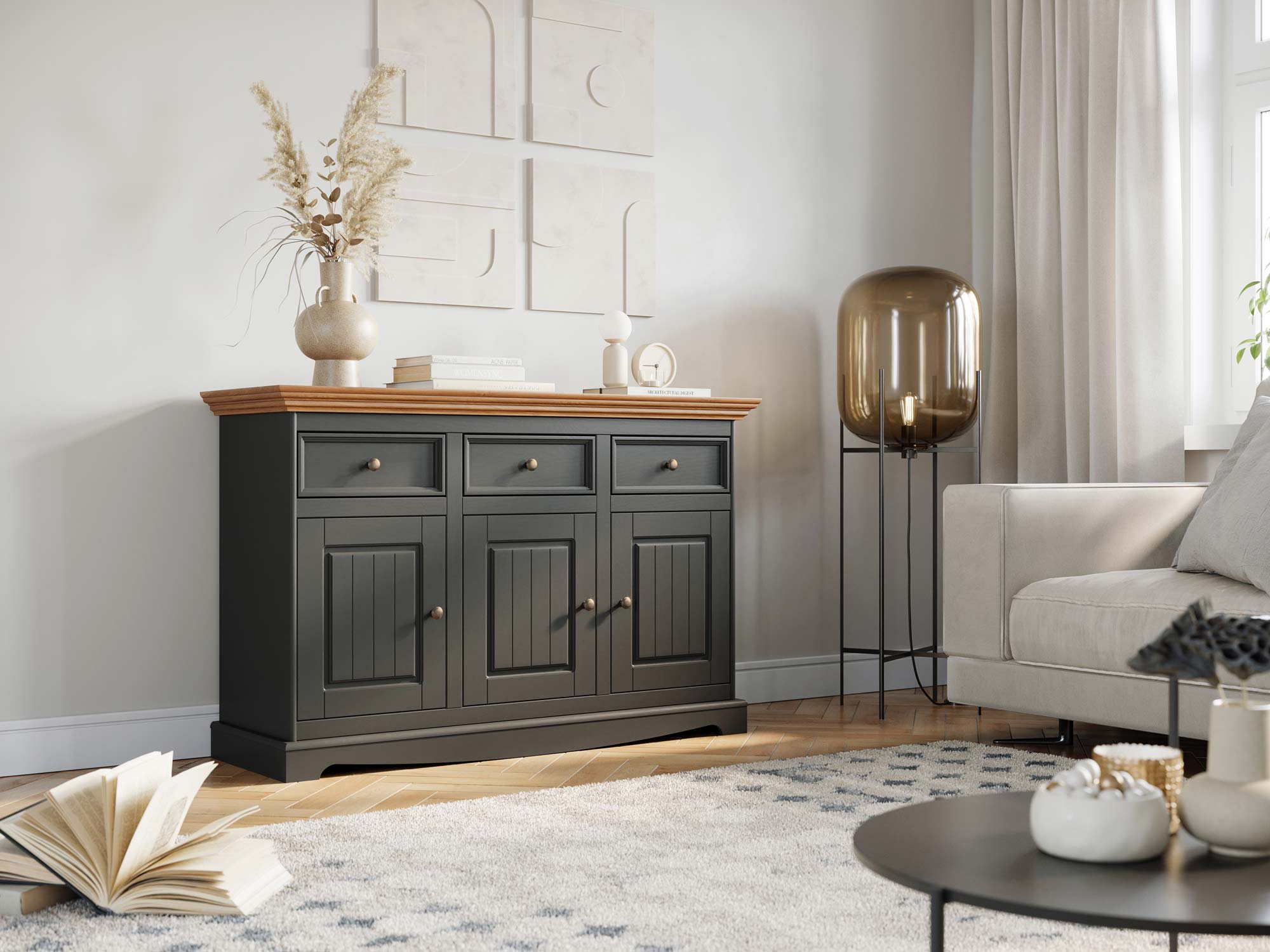 Biała klasyczna komoda drewniana grafit dąb aranżacja INGRID