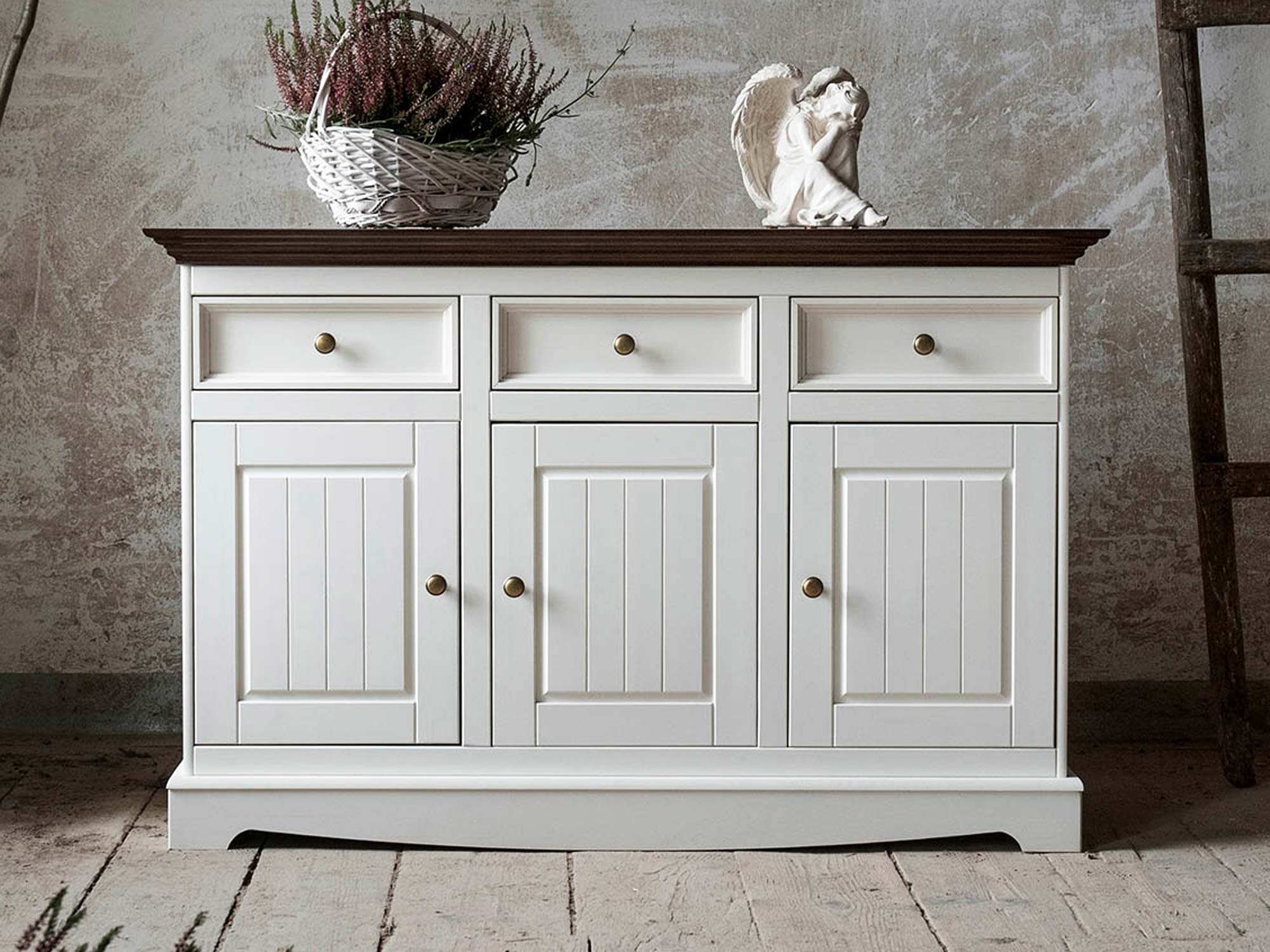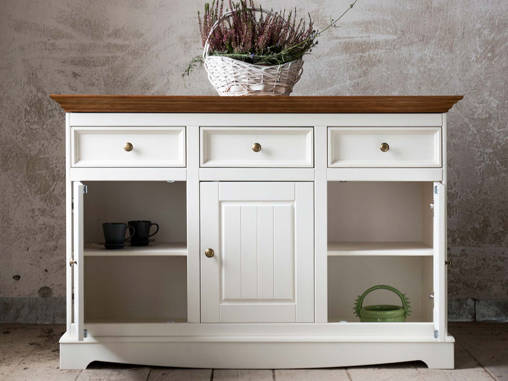 Trzy pojemne szuflady oraz szafki z półkami sprawiają, że komoda jest niezwykle pojemnym meblem, idealnym do przechowywania zastawy, tekstyliów czy dokumentów. Dzięki uniwersalnym wymiarom i klasycznej estetyce, model ten świetnie sprawdzi się zarówno w eleganckim salonie, przytulnej sypialni, jak i reprezentacyjnym przedpokoju. Ozdobne uchwyty w kolorze starego złota dodają całości wyrafinowanego akcentu vintage.