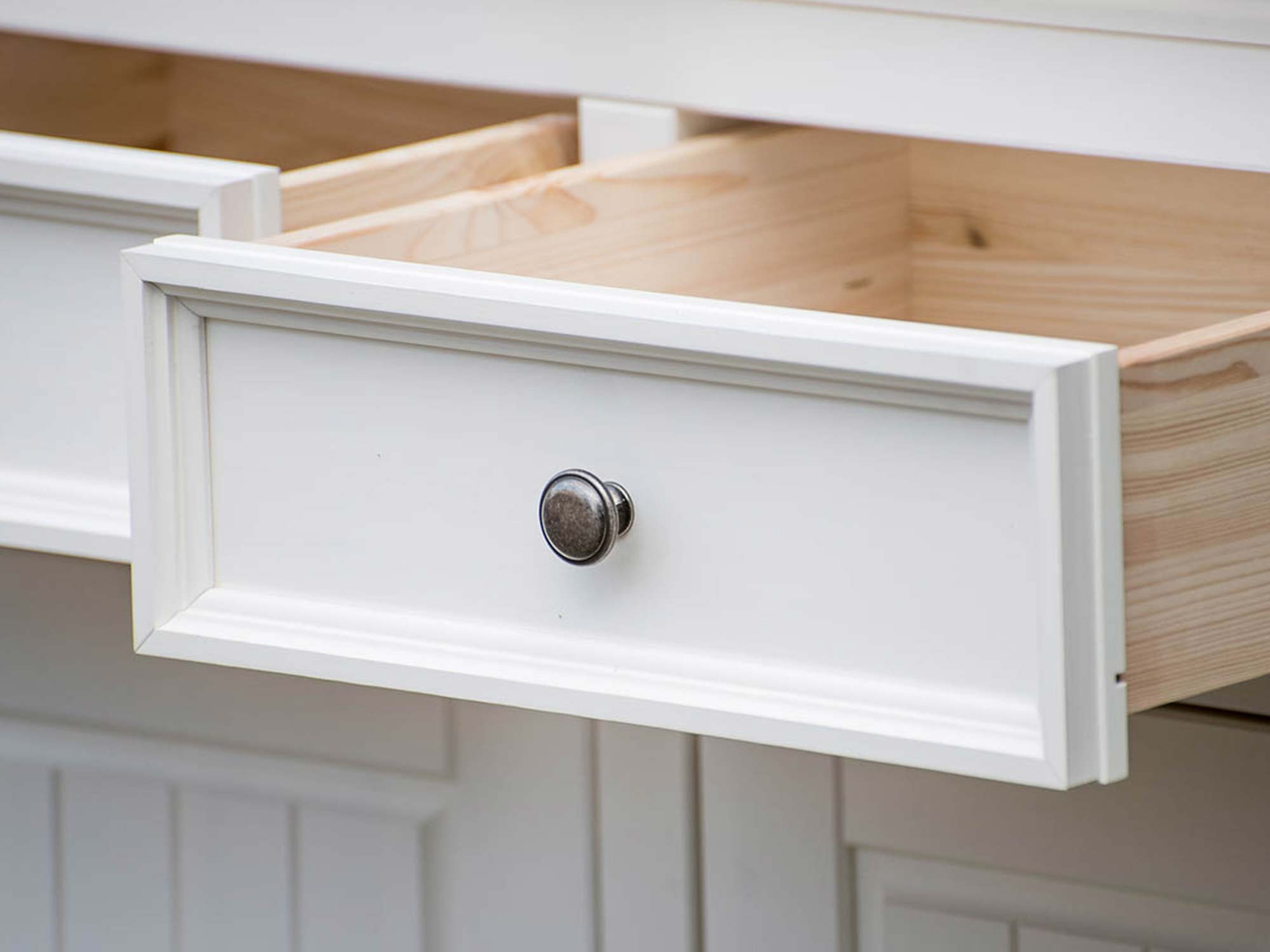 Biała klasyczna komoda drewniana szuflada otwarta INGRID