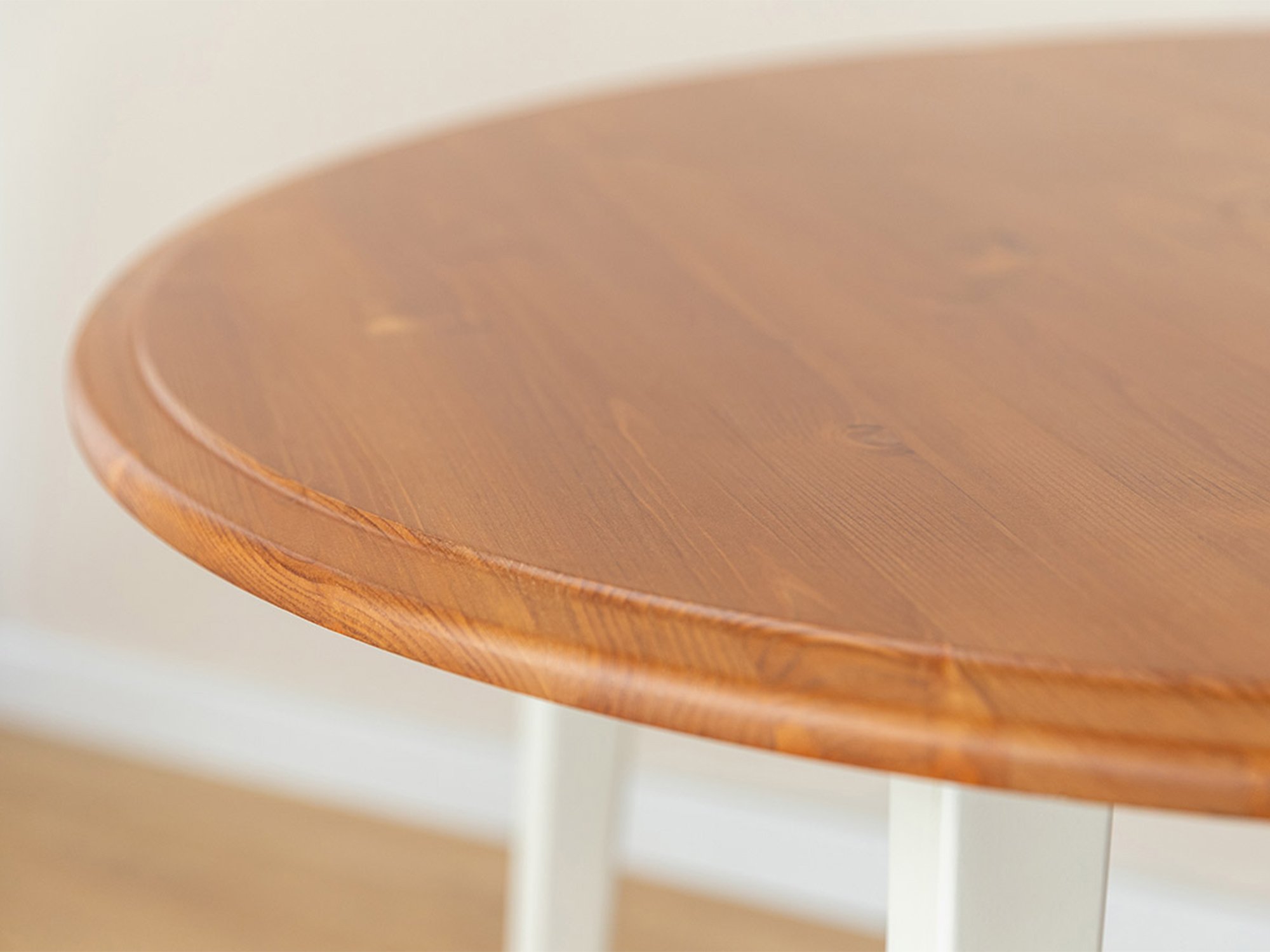 Podstawą trwałości stołu Ingrid jest wykorzystanie litego drewna sosny fińskiej, które charakteryzuje się sprężystością i wytrzymałością. Blat został starannie wybarwiony na kolor dębu, co nadaje mu elegancki i ciepły charakter, jednocześnie zachowując autentyczność naturalnego surowca. Podstawa mebla, malowana ekologiczną farbą wodną w odcieniu ciepłej bieli RAL 9010, posiada celowe krycie na poziomie około 85%. Taki zabieg pozwala na subtelne przebijanie rysunku słojów i sęków, co podkreśla drewniany rodowód mebla i odróżnia go od płyt meblowych.