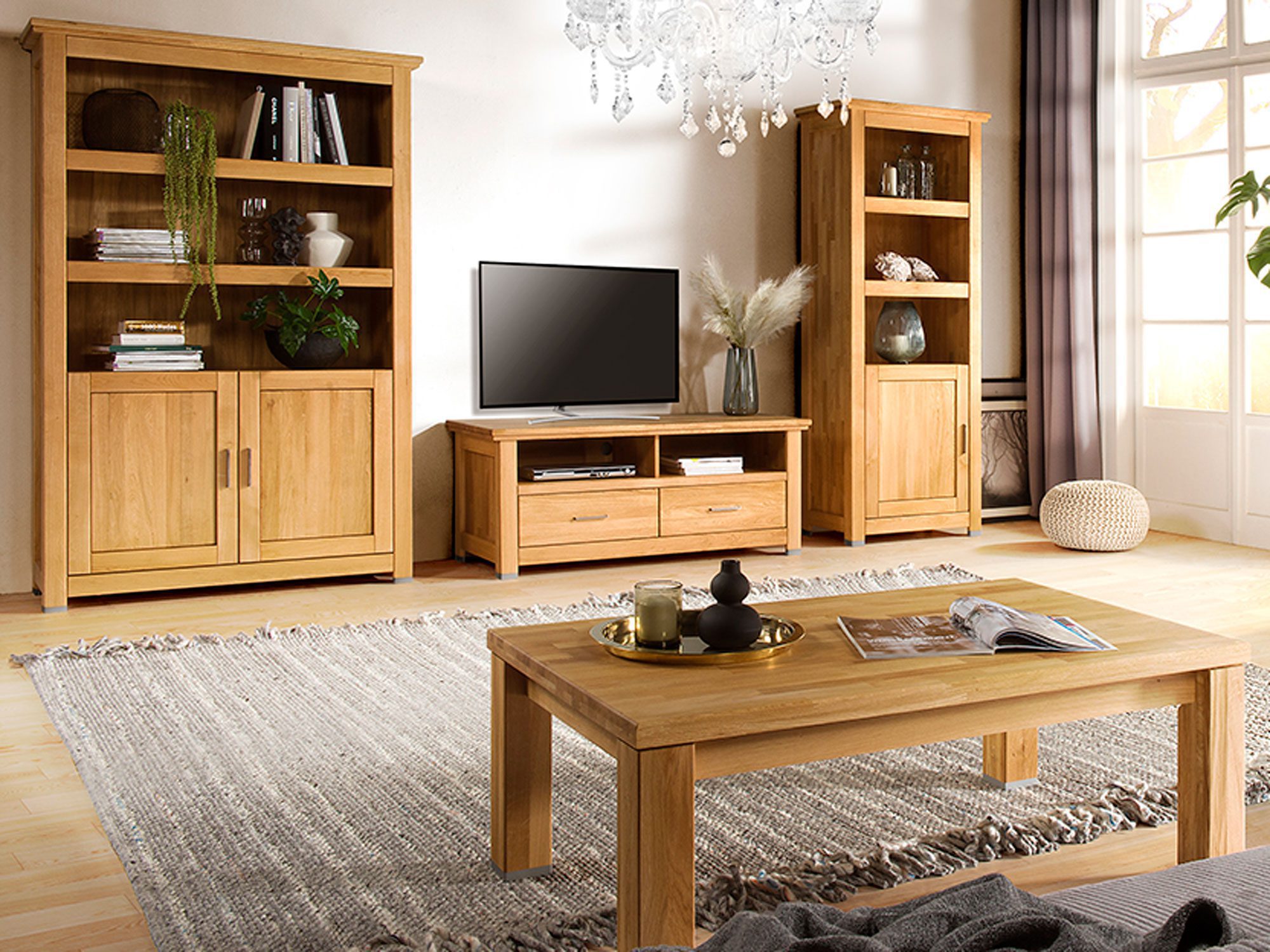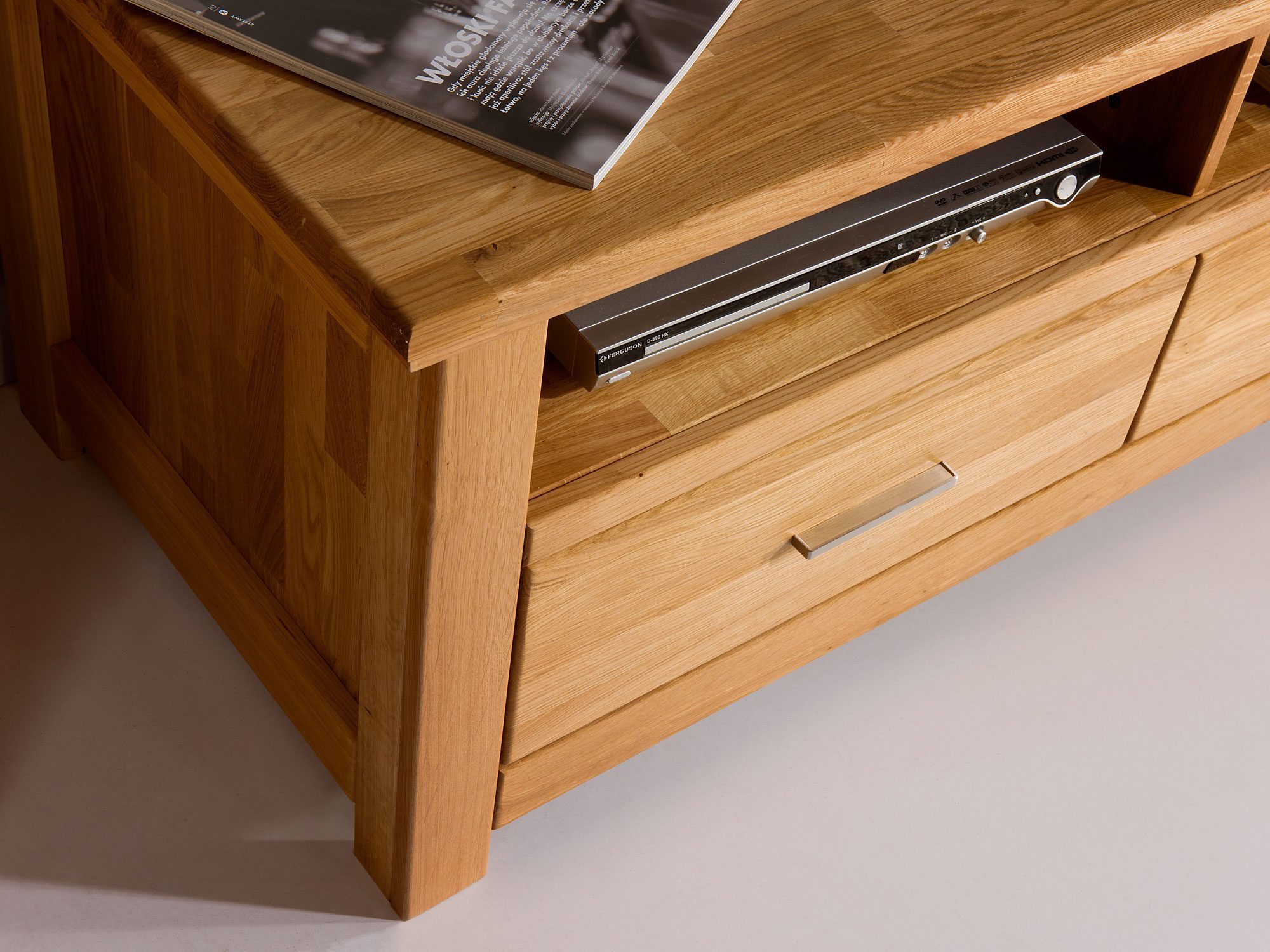 Mebel został zaprojektowany z myślą o wieloletnim użytkowaniu, wykorzystując niezaprzeczalne atuty litego drewna dębowego. Korpus wykonany z dębu sękatego celowo eksponuje naturalne cechy surowca, takie jak sęki czy zróżnicowane usłojenie, które świadczą o autentyczności i niepowtarzalnym charakterze każdego egzemplarza. Fronty z dębu czystego nadają bryle elegancji, a całość zabezpieczona jest wysokiej jakości olejem, który chroni drewno, pozwala mu oddychać i wydobywa głębię koloru dąb natura.