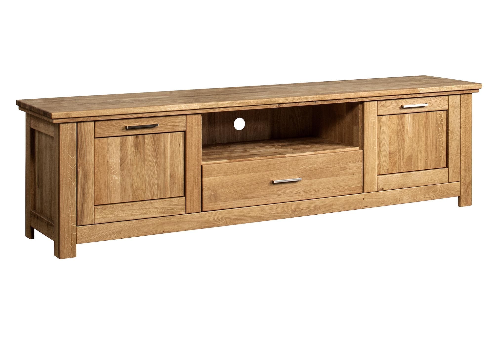 Stylowa i nowoczesna dębowa szafka RTV wykonana z najwyższej jakości litego drewna dębowego świetnie dostosuje się do każdej aranżacji w salonie, pokoju dziennym czy jadalni. Ponadto mocna struktura oraz nowomodne, stylowe szlifowanie sprawią, że niska szafka pod telewizor świetnie dopasuje się do każdej stylizacji. Meble ma funkcjonalne drzwiczki, praktyczną półkę oraz pakowną szufladę, dzięki czemu stanowi znakomite rozwiązanie pod sprzęt TV/RTV, dla którego z pewnością znajdzie się na niej miejsce.