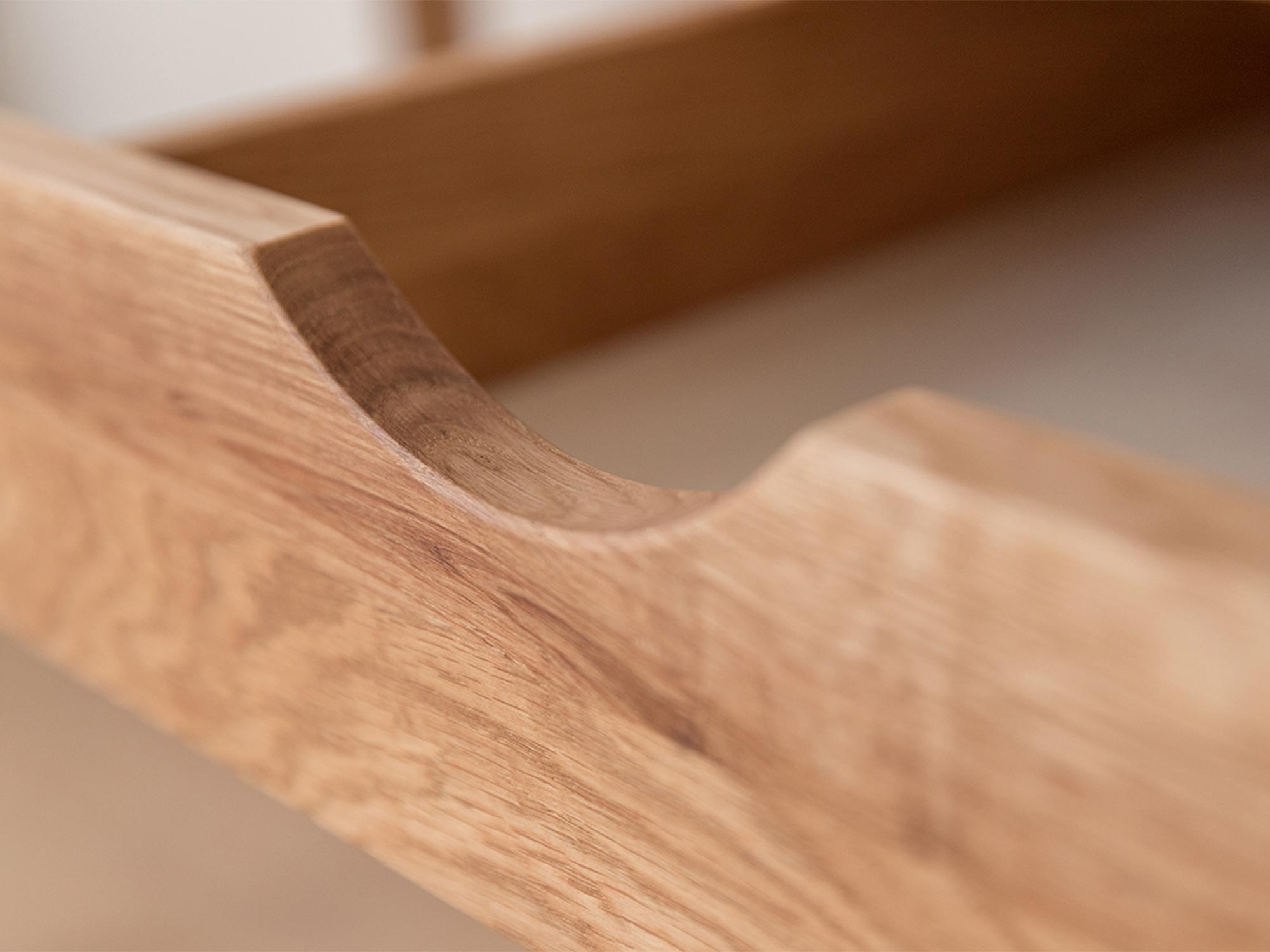 Detal szuflady szafy dębowej, wyprofilowane uchwyty