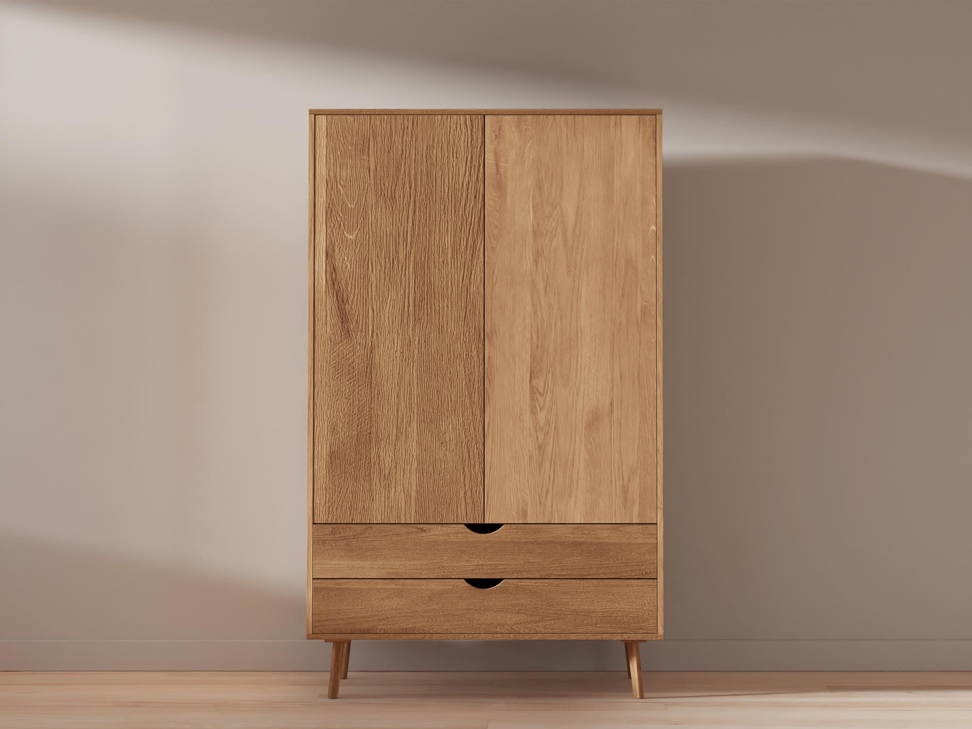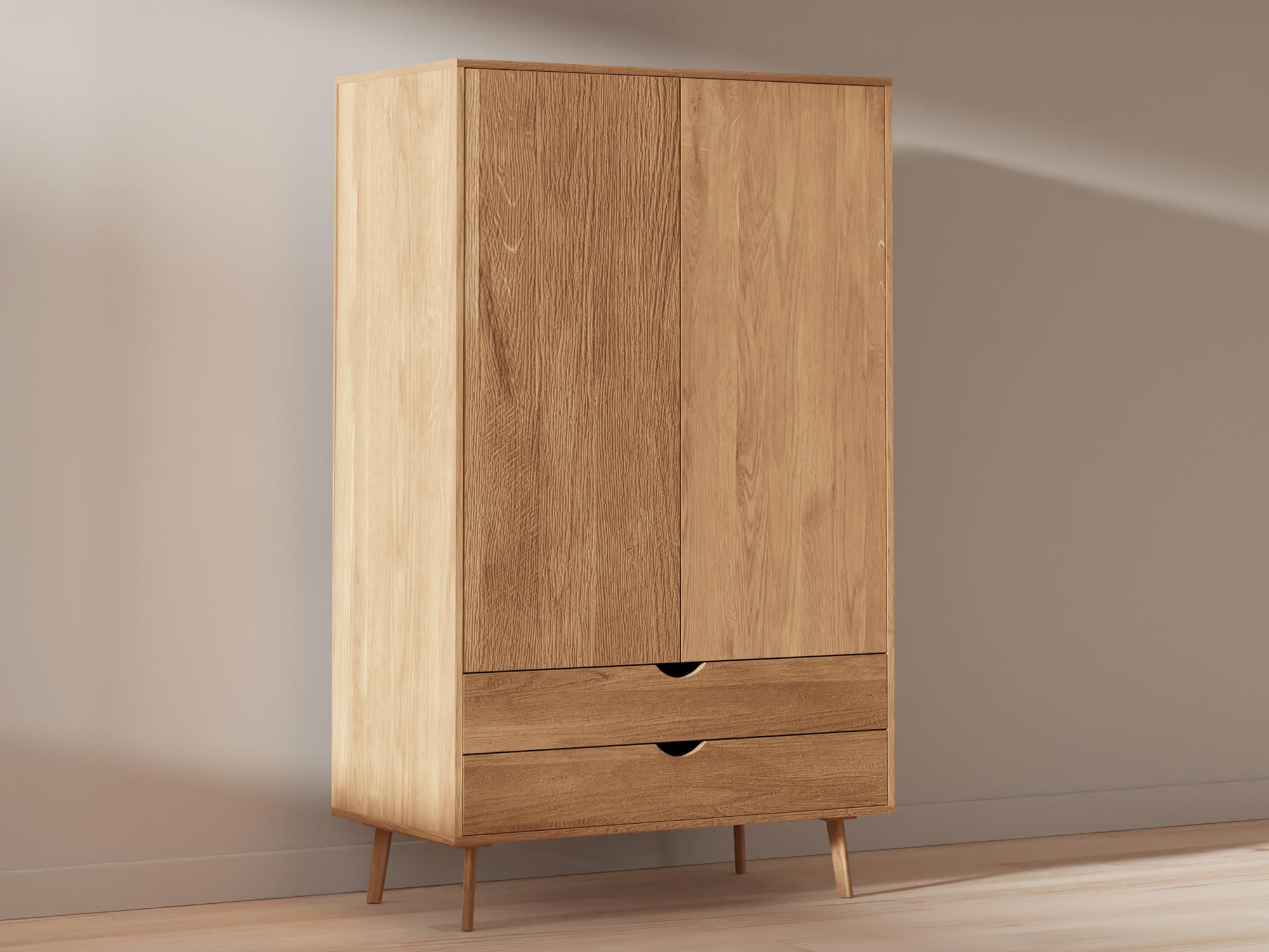 Wysoka szafa dębowa z szufladą, prosty skandynawski styl