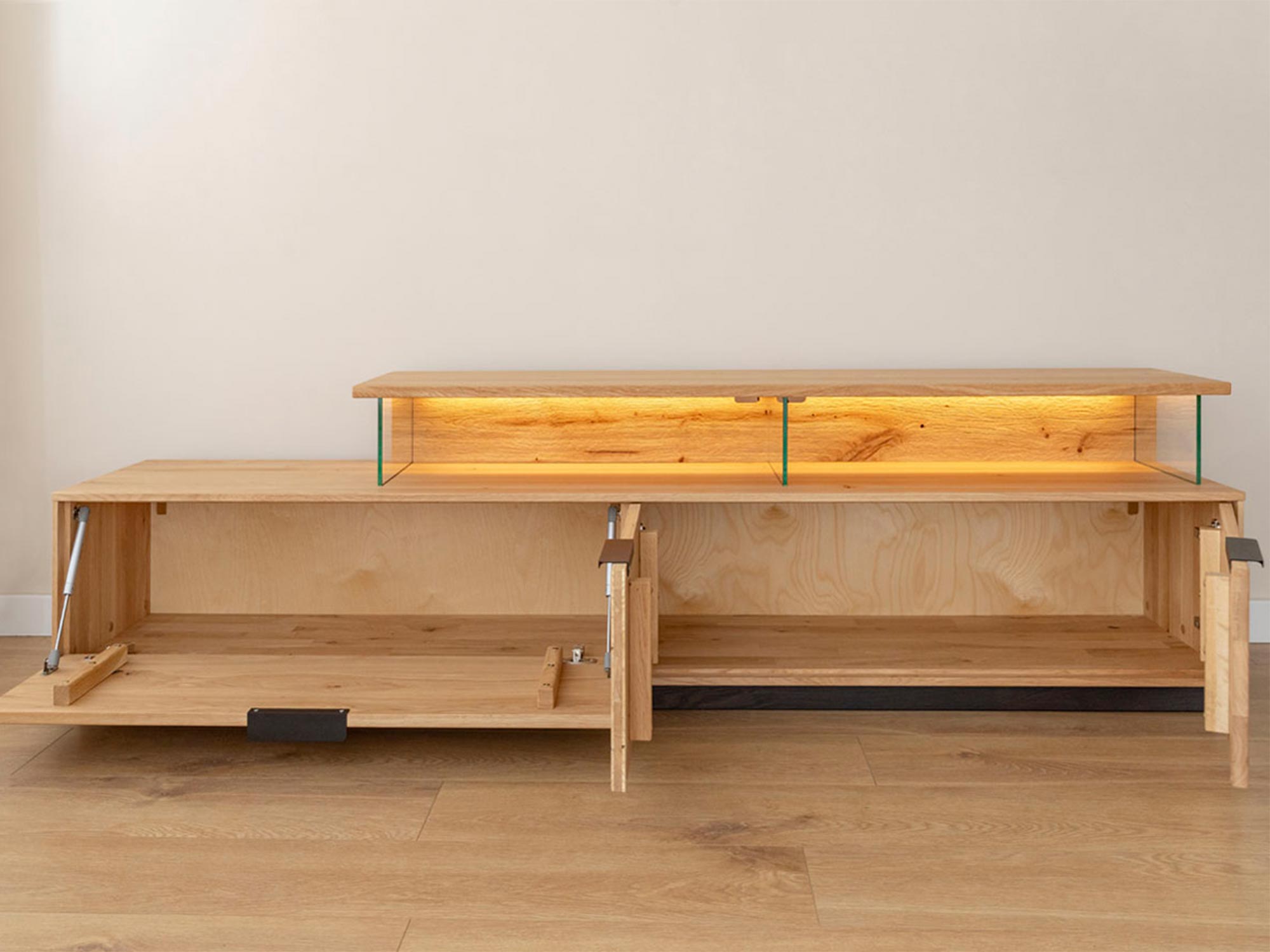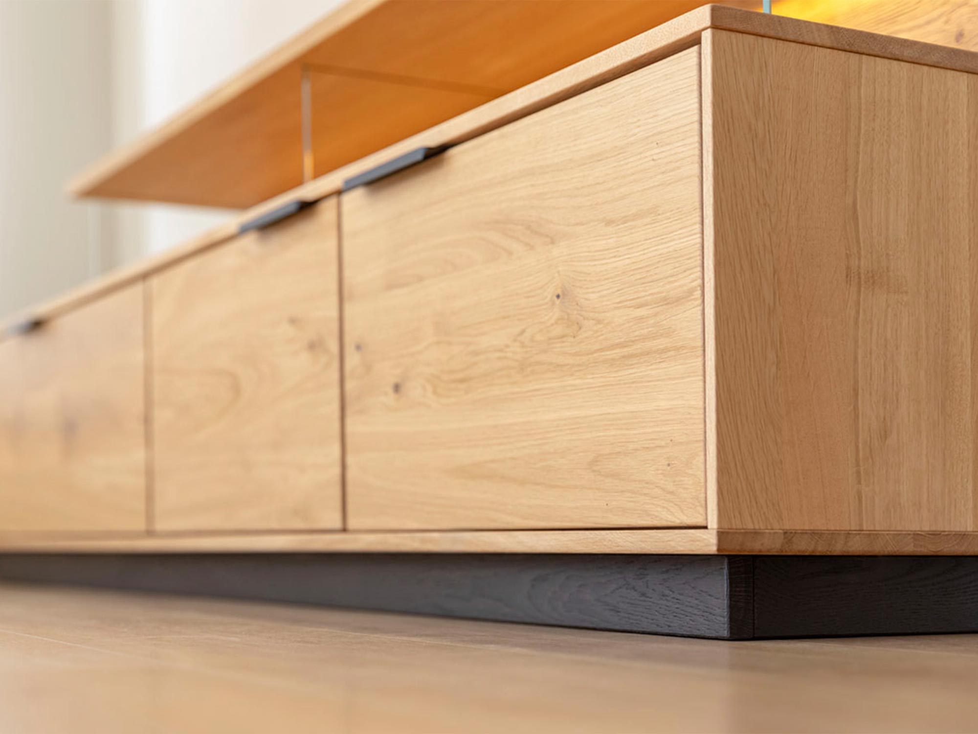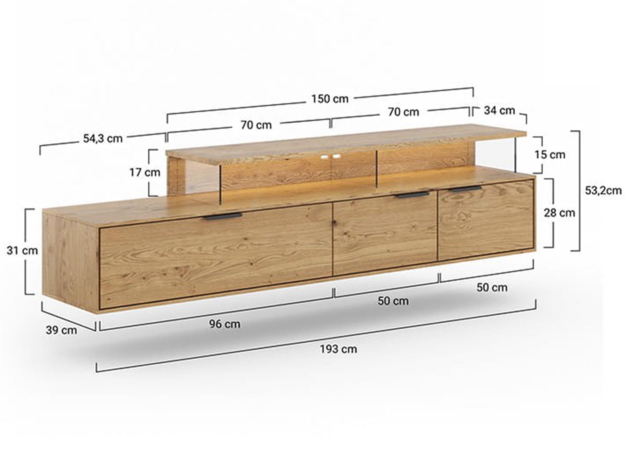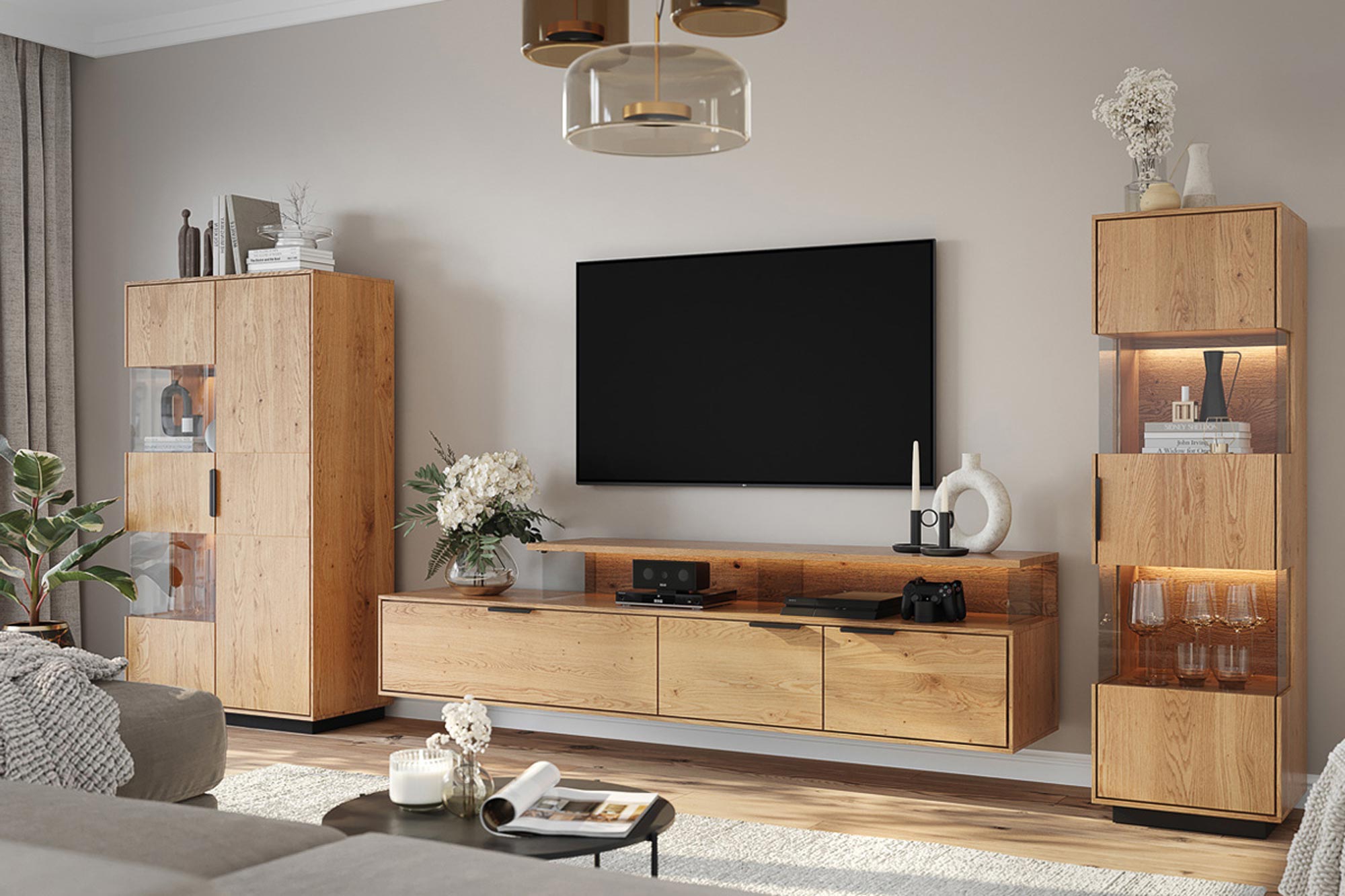 Jednym z wyjątkowych atutów szafki Wisząca Szafka RTV Dębowa Loftwood jest zintegrowane oświetlenie, które wprowadza do wnętrza przytulną atmosferę. Dotykowy włącznik, umiejętnie ukryty w konstrukcji mebla, to nowoczesne i wygodne rozwiązanie, które pozwala w łatwy sposób sterować oświetleniem. Tego rodzaju detale nie tylko podnoszą komfort użytkowania, ale także wnoszą do wnętrza odrobinę luksusu.