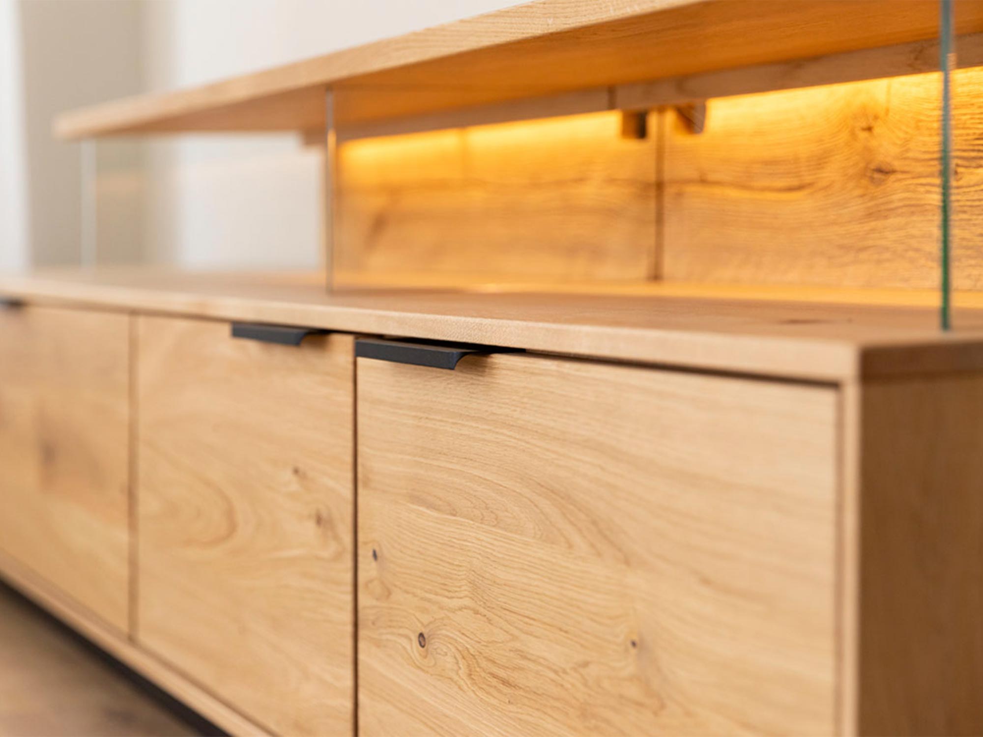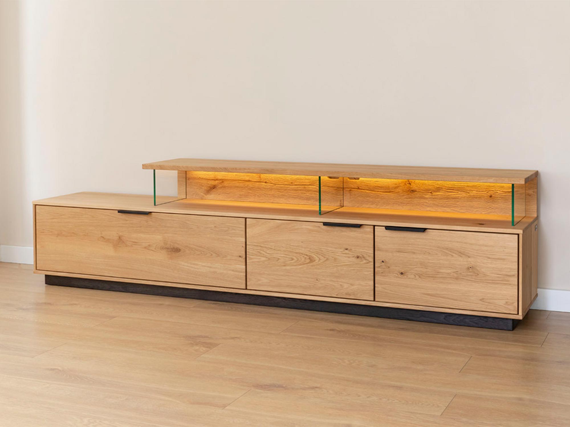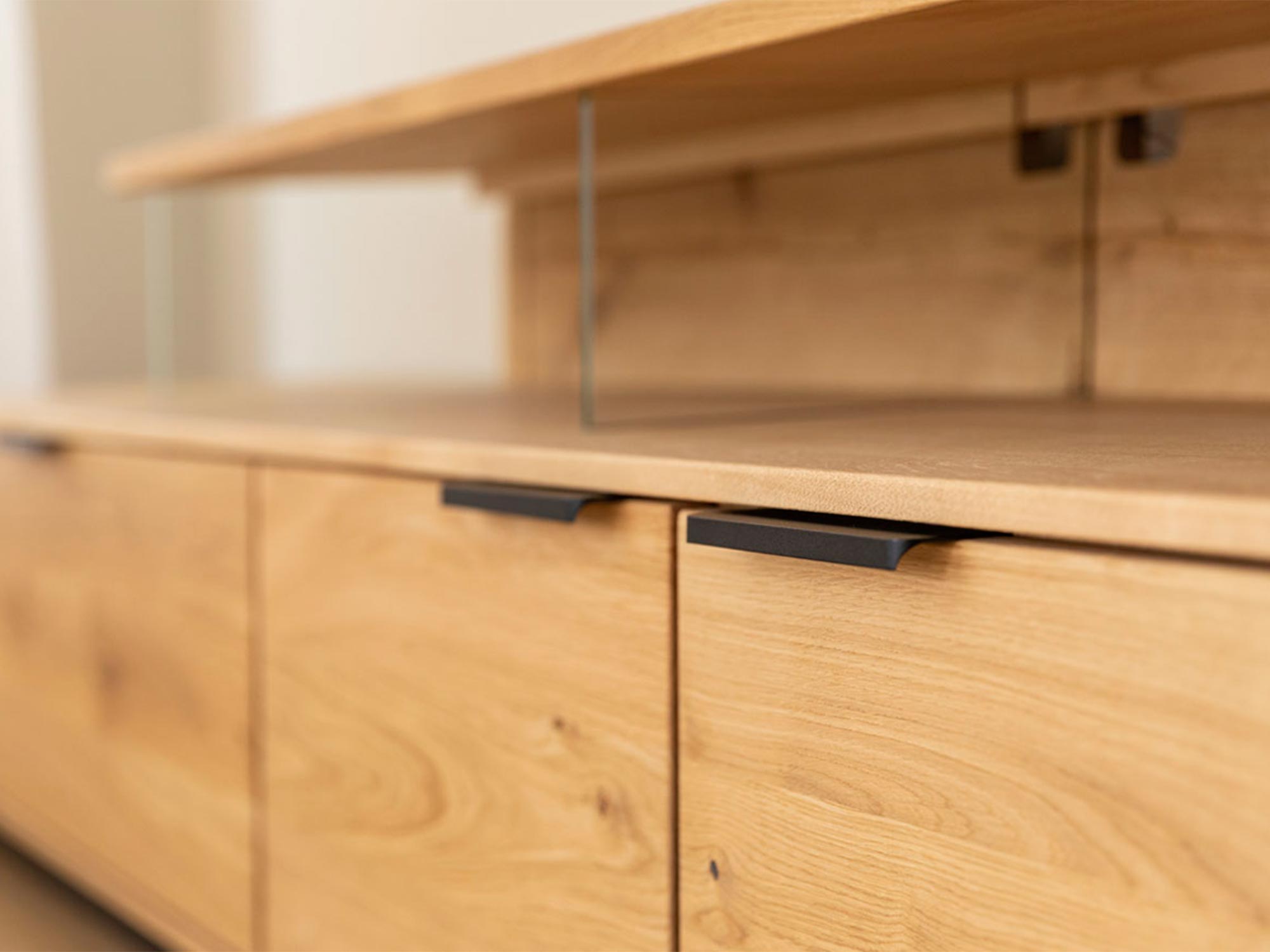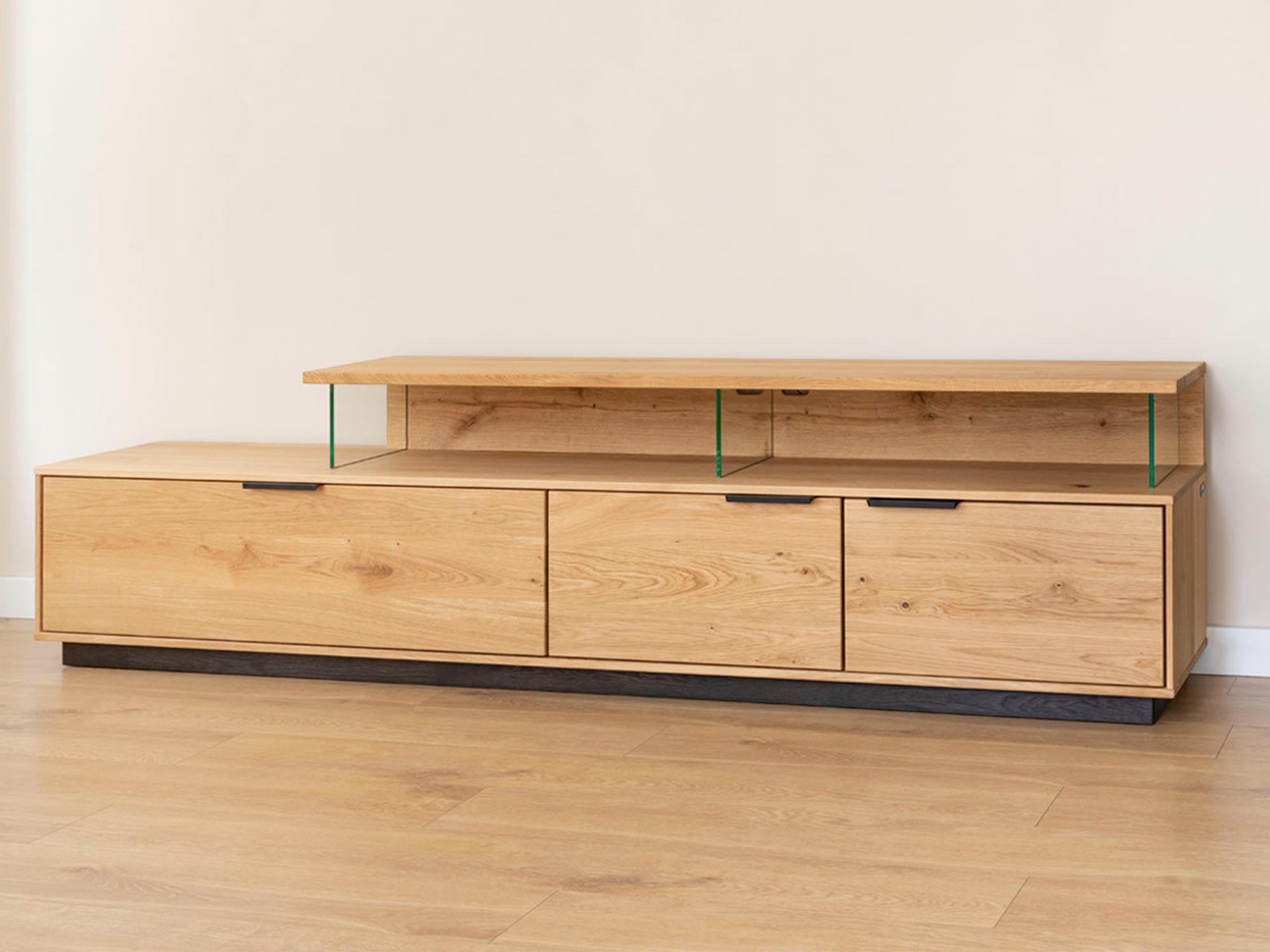 Szczotkowane i dębowe elementy, widoczne za szklanymi frontami, podkreślają naturalną elegancję materiałów, a czarne, matowe uchwyty doskonale dopełniają całość, nadając meblowi nowoczesny, industrialny wygląd. Dzięki takiemu połączeniu, szafka prezentuje się elegancko, ale jednocześnie nie przytłacza wnętrza, w którym się znajduje.