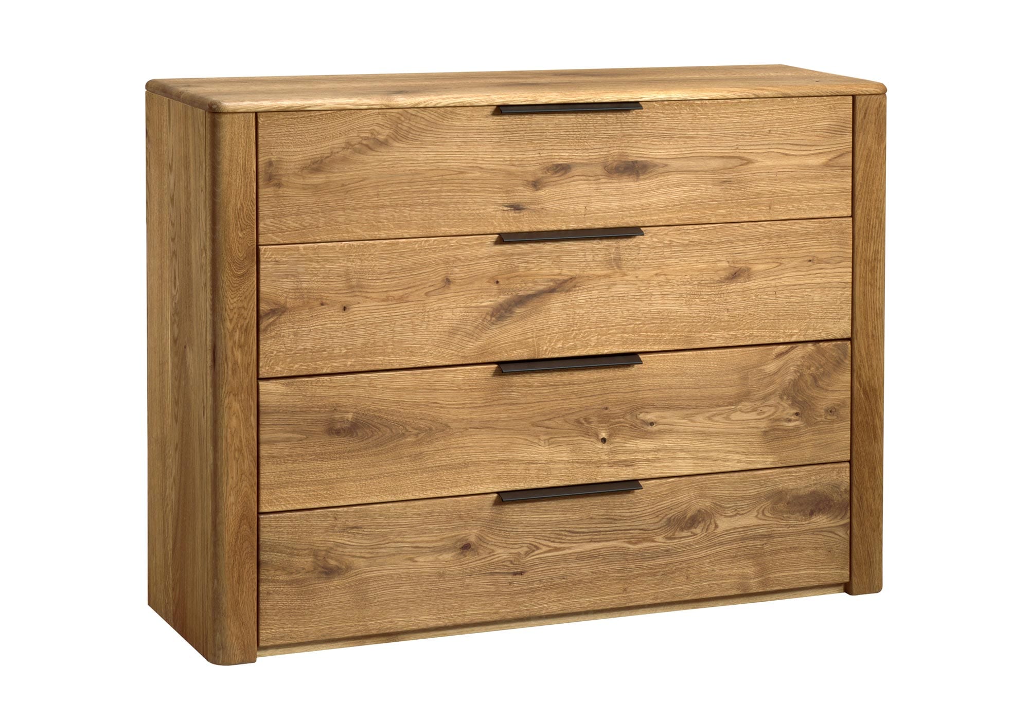 Prezentowany model to kwintesencja naturalnego piękna, które zawdzięczamy zastosowaniu szlachetnych materiałów. Fronty wykonane z litego drewna dębowego zachwycają unikalną strukturą, w której widoczne sęki są celowym zabiegiem stylistycznym, podkreślającym autentyczność surowca. Korpus mebla wykończony naturalnym fornirem dębowym idealnie koresponduje z frontami, tworząc spójną i harmonijną całość. Olejowane wykończenie w kolorze dąb natura nie tylko zabezpiecza powierzchnię, ale także wydobywa głębię koloru i rysunek słojów, sprawiając, że każdy egzemplarz jest jedyny w swoim rodzaju.