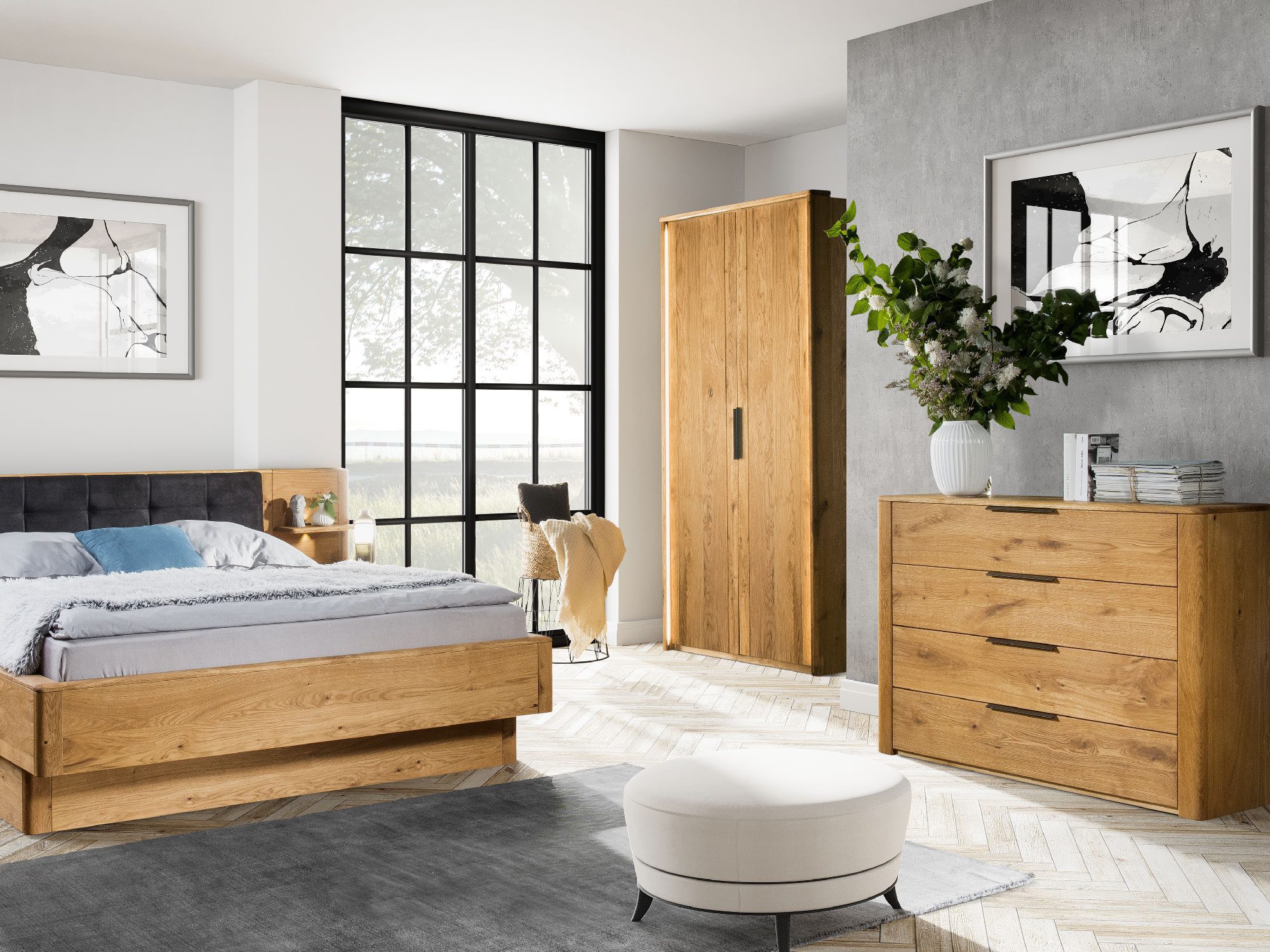 Sypialnia z łóżkiem, komodą i szafą z naturalnego drewna
