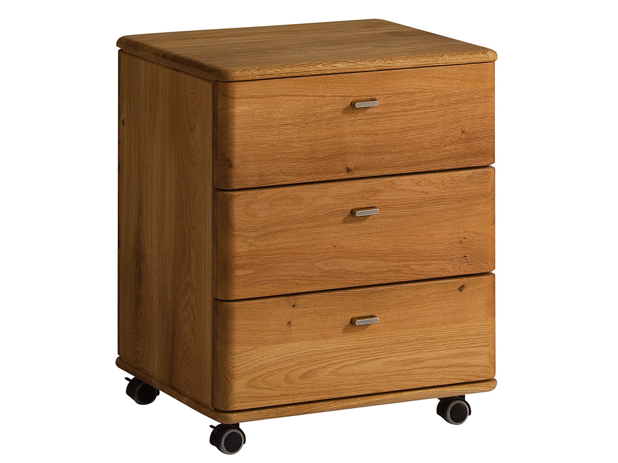 Przede wszystkim Kontenerek Drewniany Biurowy na Kółkach Maseri wykonany litego drewna dębowego w naturalnym kolorze to niezwykle praktyczny mebel. Będzie on świetnym rozwiązaniem we wnętrzu biura czy gabinetu. Posiada trzy szuflady, dzięki czemu zapewnia dużo miejsca do przechowywania dokumentów czy tez innego rodzaju drobnych przedmiotów. Ponadto powierzchnia mebla jest szczotkowana przeć co doskonale czuć oryginalną strukturę drewna. Kontenerem wyposażony został w układ jezdny, dzięki któremu łatwo go przesunąć w dowolne miejsce.