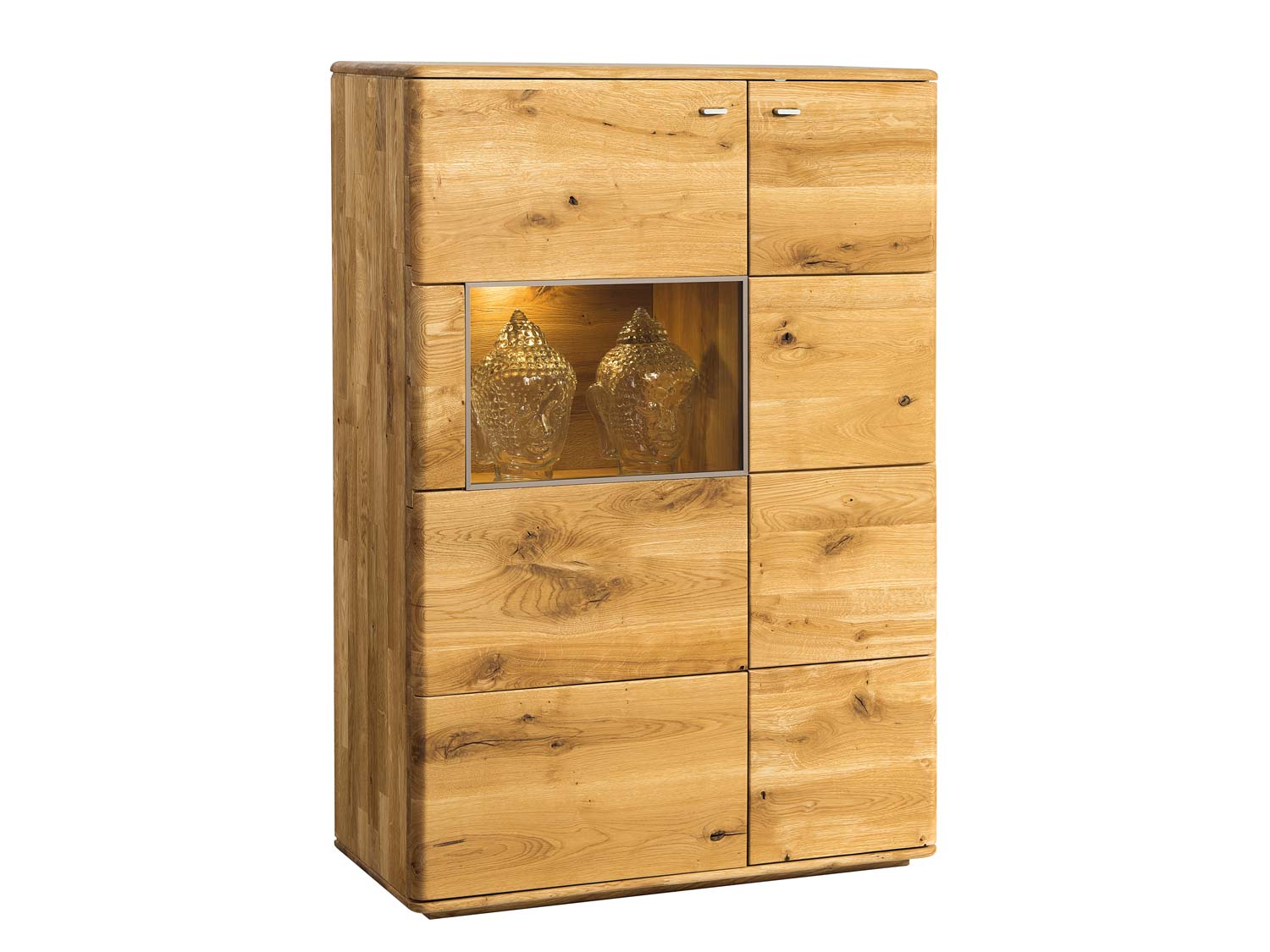 Szafka Maseri została zaprojektowana z myślą o maksymalnej użyteczności, łącząc w sobie strefę ekspozycyjną z praktycznymi schowkami. Przeszklona część frontu idealnie nadaje się do prezentacji rodowej porcelany, szkła lub ulubionych pamiątek, które można dodatkowo podkreślić opcjonalnym oświetleniem. Dolna, zabudowana część mebla oferuje pojemną przestrzeń na tekstylia, dokumenty czy inne przedmioty, które chcemy ukryć przed wzrokiem gości. Nowoczesna forma bryły sprawia, że mebel ten świetnie komponuje się zarówno w aranżacjach industrialnych, jak i w przytulnych wnętrzach w stylu boho czy rustykalnym.