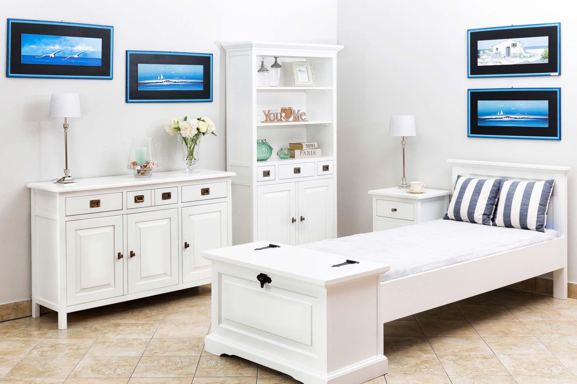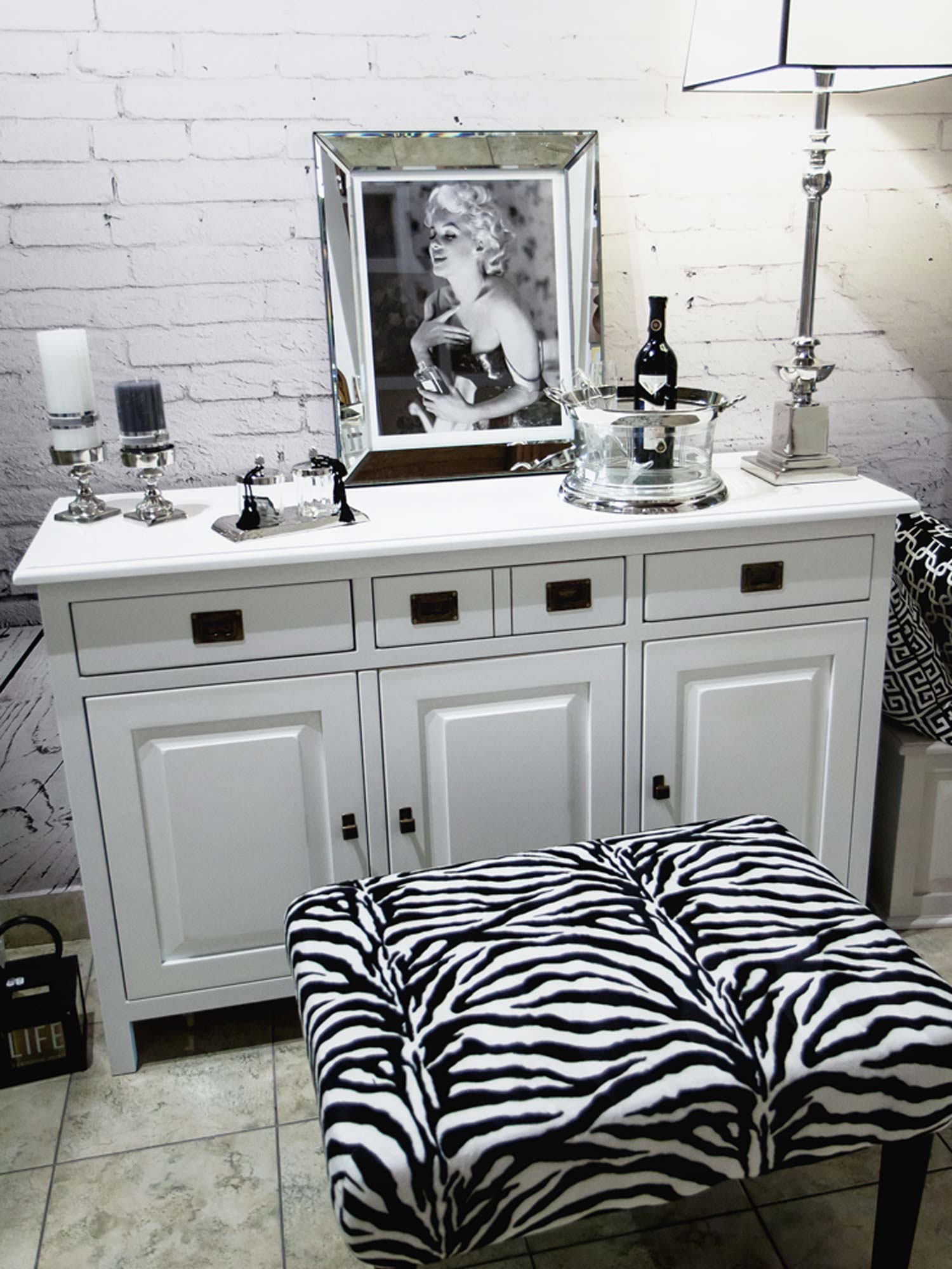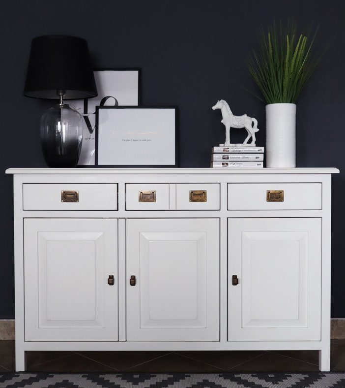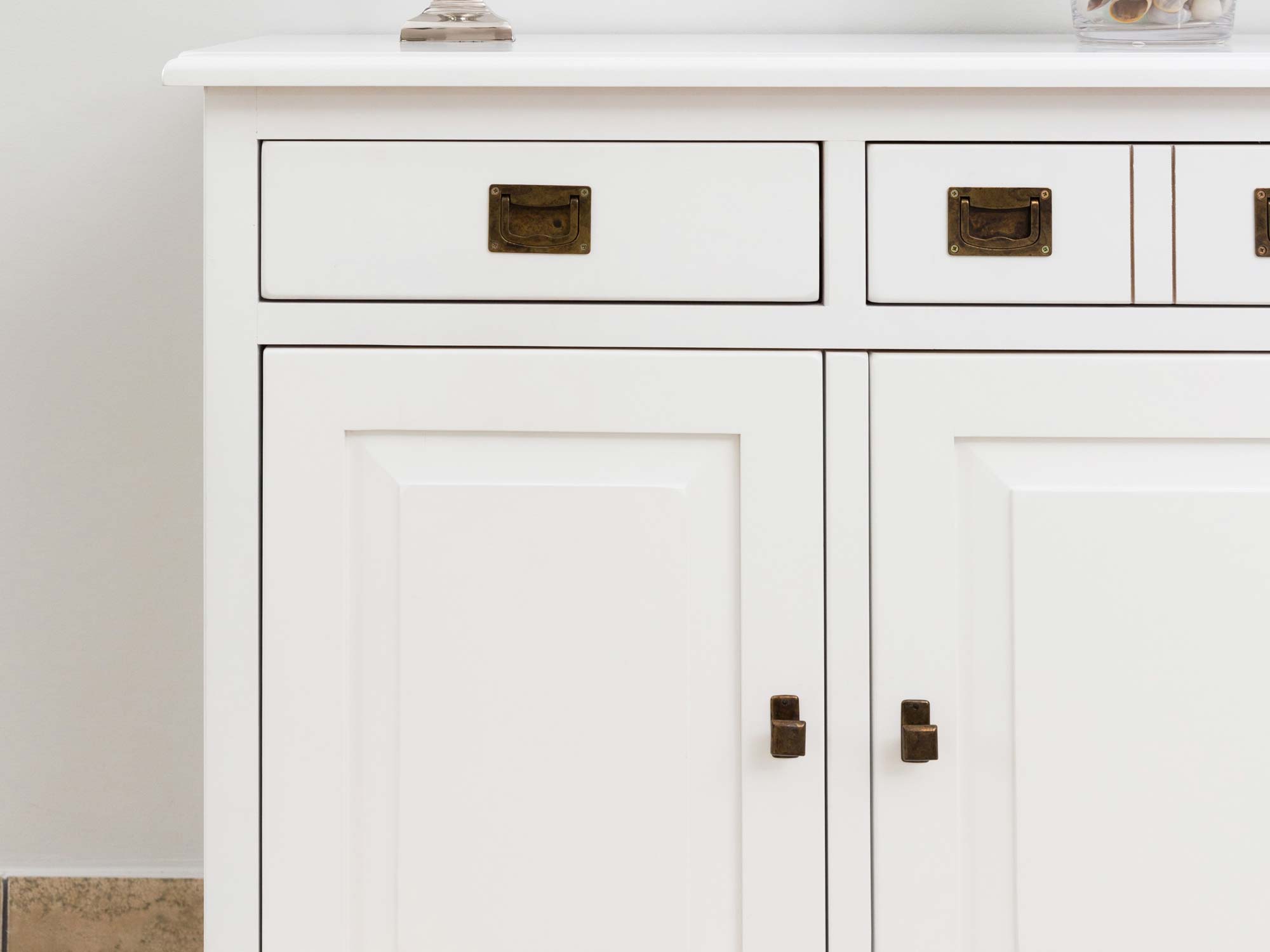 Klasyczny design komody idzie w parze z przemyślanym układem wnętrza, oferującym wygodny dostęp do przechowywanych rzeczy. Mebel wyposażony jest w pojemne szuflady oraz zamykane szafki, w których umieszczono po jednej półce, co ułatwia segregację domowych tekstyliów czy zastawy stołowej. Metalowe, stylizowane uchwyty nie tylko dodają uroku, ale zapewniają też komfortowe otwieranie, a solidna konstrukcja gwarantuje niezawodność podczas codziennego użytkowania.