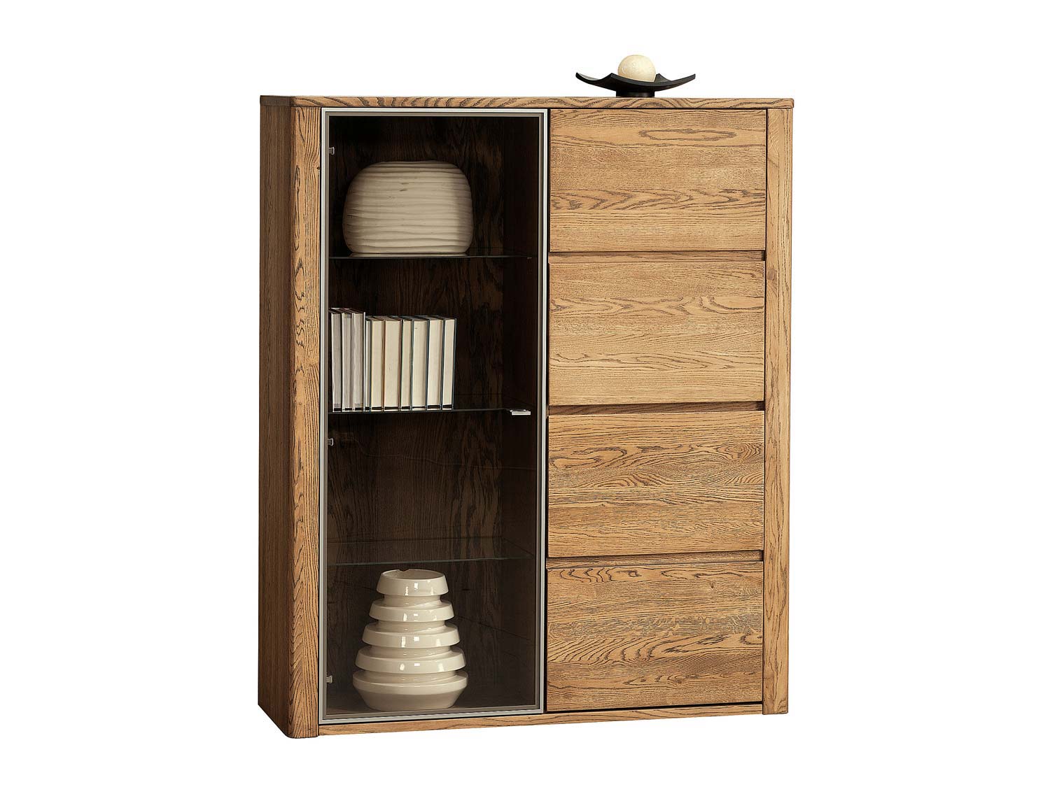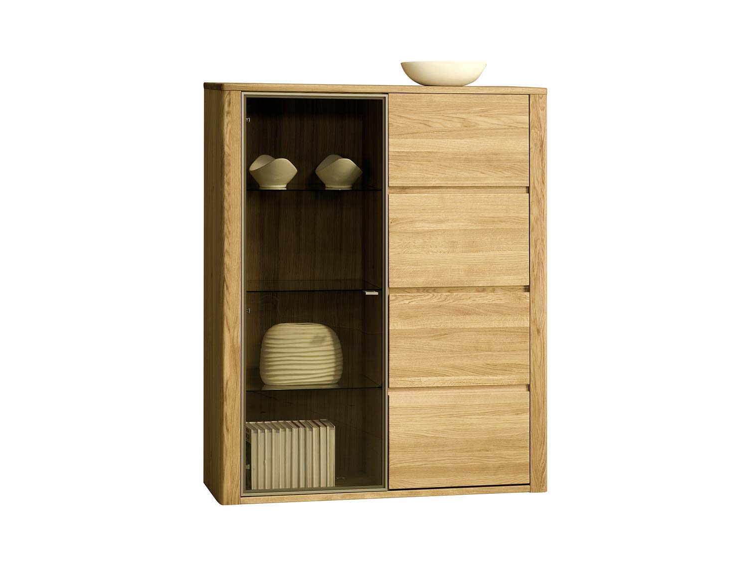 Prezentowana witryna to mistrzowskie połączenie litego drewna dębowego na frontach oraz wysokiej jakości korpusu w naturalnej okleinie dębowej. Powierzchnia mebla może być wykończona olejem lub woskiem, co podkreśla unikalną strukturę słojów i sęków, czyniąc każdy egzemplarz niepowtarzalnym. W zależności od wybranego wariantu kolorystycznego – od ciepłego Bursztynu po subtelną Naturę czy Bianco – drewno może być szczotkowane, co pozwala wyczuć jego strukturę pod palcami, lub pozostawione gładkie. Naturalne cechy drewna, takie jak sęki, są świadectwem jego autentyczności i nie stanowią wady, lecz atut estetyczny.
