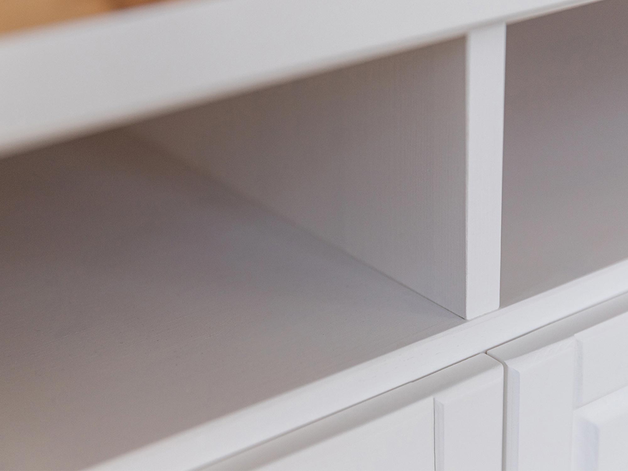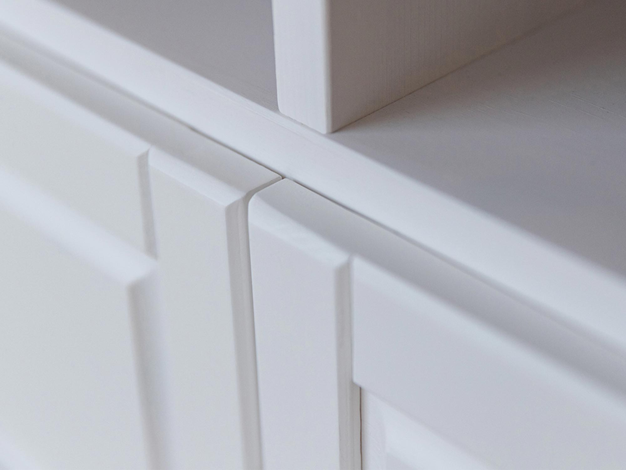 Mebel zachwyca dbałością o detale, które są charakterystyczne dla klasycznego wzornictwa z nutą nowoczesności. Frezowany cokół oraz delikatne ramy na frontach nadają bryle lekkości i wyrafinowanego charakteru, a minimalistyczne, drewniane uchwyty w formie gałek dopełniają całości. Zastosowanie naturalnego drewna sosnowego sprawia, że każdy egzemplarz jest unikatowy, posiadając niepowtarzalny układ sęków i słojów. Połączenie bieli z naturalnym odcieniem drewna na blacie to sprawdzony sposób na ocieplenie wnętrza i dodanie mu przytulności.