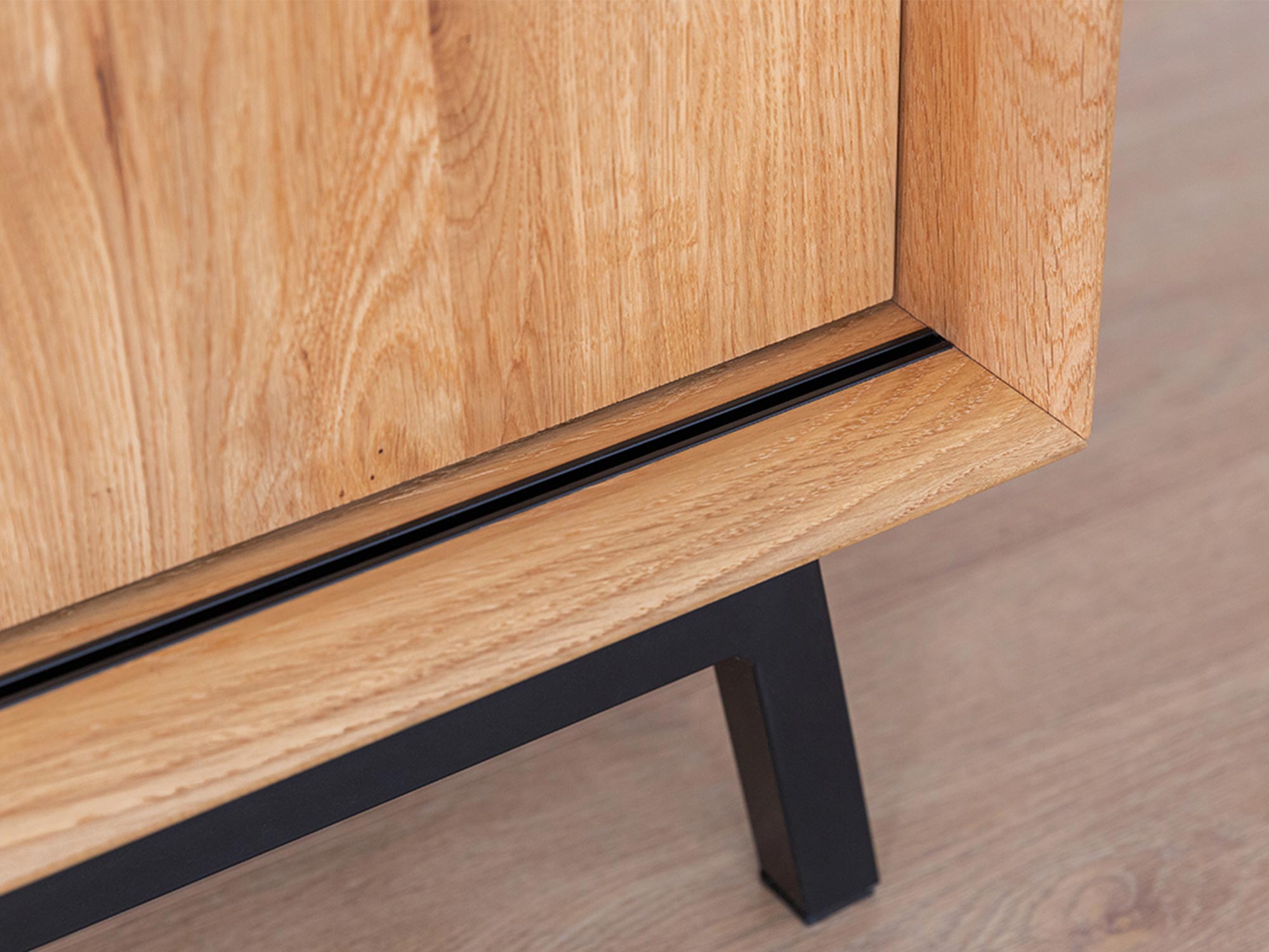 Nowoczesna szafka RTV z dębu i czarną stalową podstawą