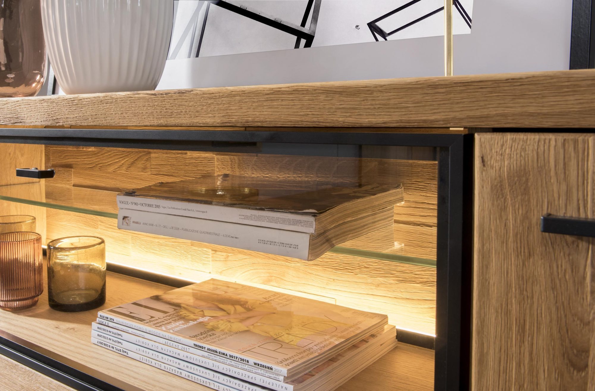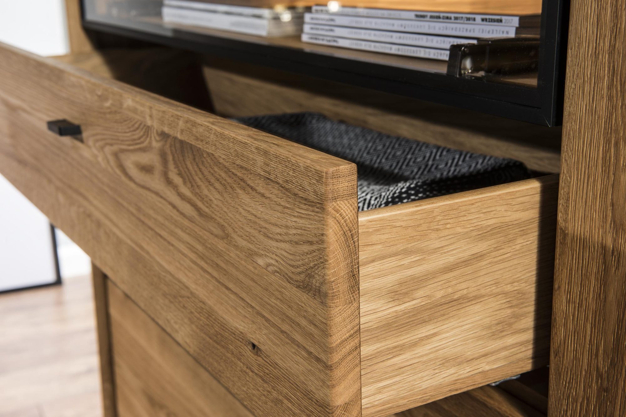 Gustowna i nowomodna komoda Toledo do pokoju zrobiona z litego drewna dębowego najlepszego gatunku z fornirowanymi detalami idealnie dopasuje się do każdego wnętrza niejednej jadalni czy salonu. Stateczna konstrukcja oraz gustowne i awangardowe wykończenie sprawią, że drewniana komoda do salonu fenomenalnie uatrakcyjni każde wnętrze. Toledo posiada funkcjonalne drzwiczki, klapę i bardzo praktyczną szufladę, a także przeszkloną cześć, która wyeksponuje każdą dekorację.