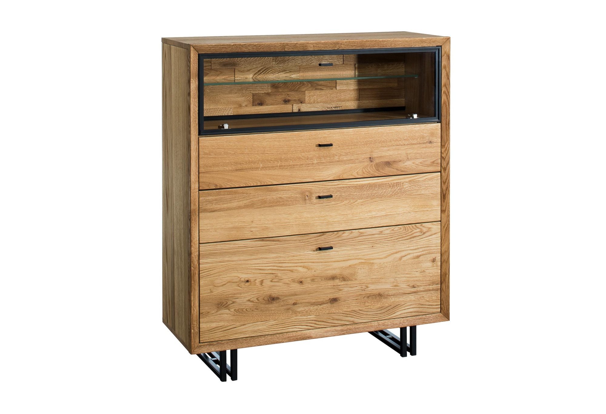 Gustowna i nowomodna szafka do salonu Toledo wyprodukowana z najlepszej klasy litego dębu dlatego idealnie dopasuje się do każdego wnętrza każdej jadalni i pokoju dziennego. Co więcej stateczna konstrukcja oraz eleganckie, nowoczesne wykończenie sprawią, że komoda drewniana z szufladami fenomenalnie uatrakcyjni każdy salon. Toledo ma dwie funkcjonalne szuflady, jedną szafkę z klapą, a także szafkę z przeszkloną częścią.