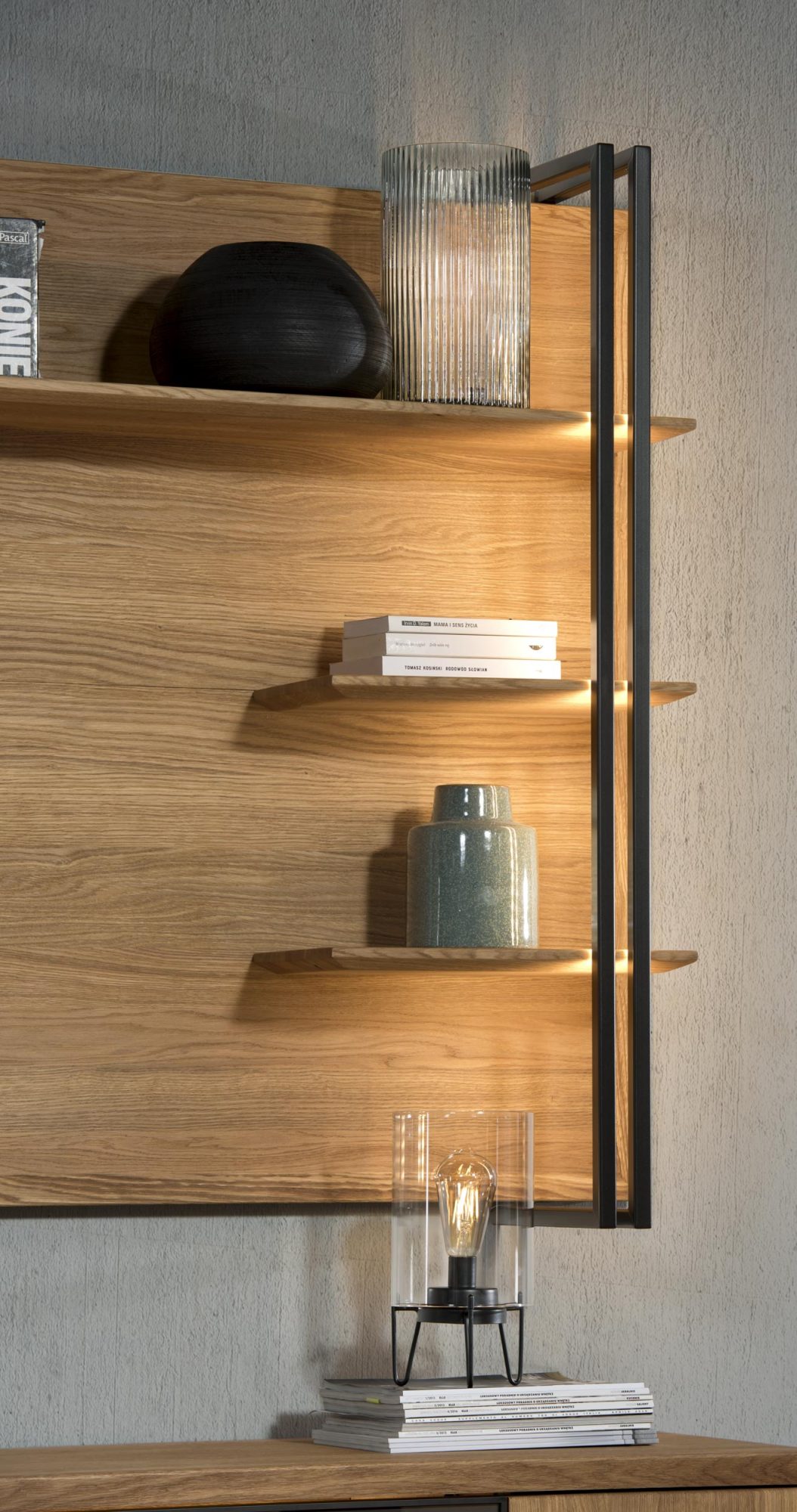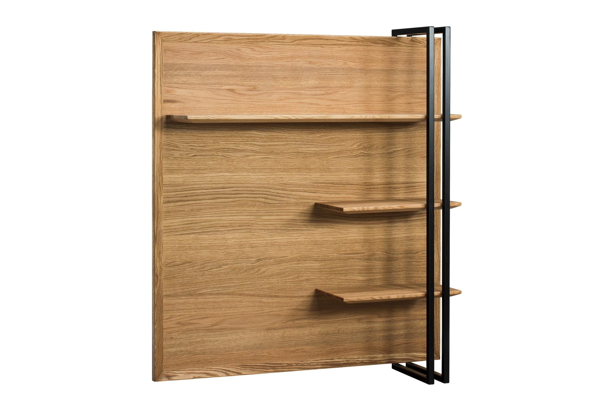 Mebel ten nie tylko pełni funkcję dekoracyjną, ale jest również niezwykle praktycznym rozwiązaniem do zagospodarowania pustej ściany. Solidne półki pozwalają na bezpieczne przechowywanie książek, trofeów czy ozdobnych drobiazgów, które nadają wnętrzu osobistego charakteru. Metalowa wstawka przełamuje klasyczną formę drewna, dzięki czemu panel świetnie komponuje się zarówno w aranżacjach klasycznych, jak i tych o bardziej industrialnym zacięciu.