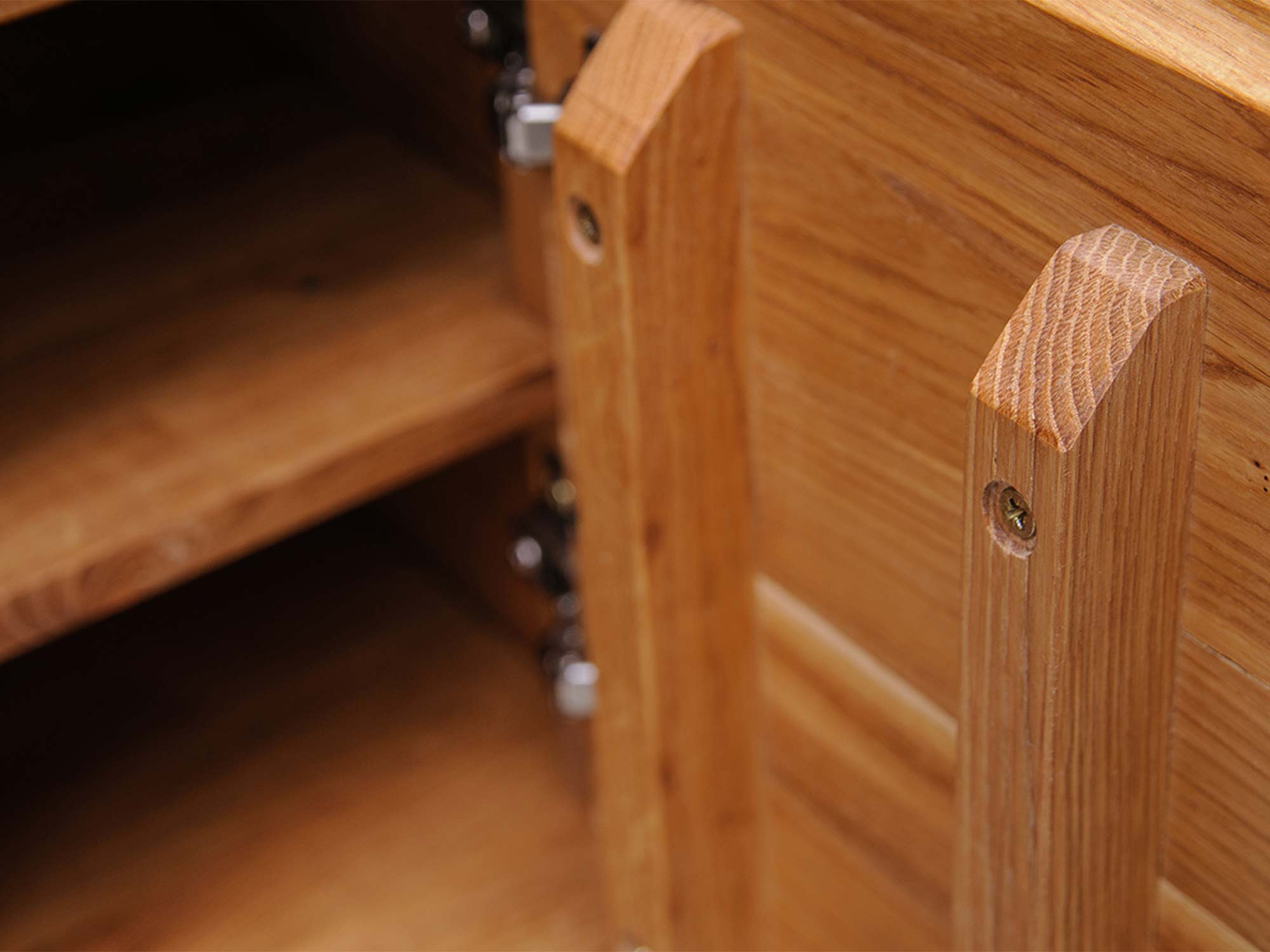 Zawiasy i półka w szafce z litego drewna dębowego