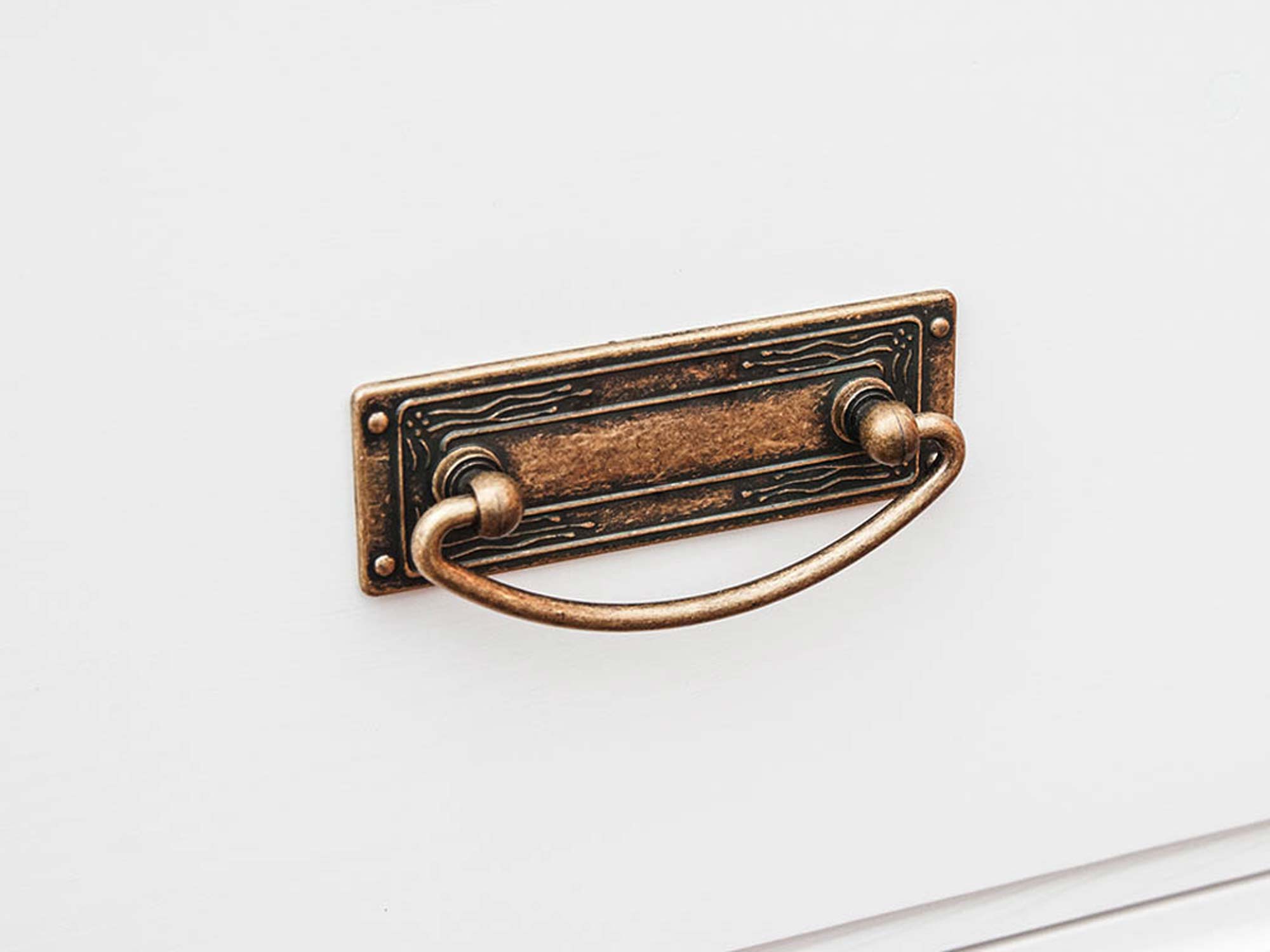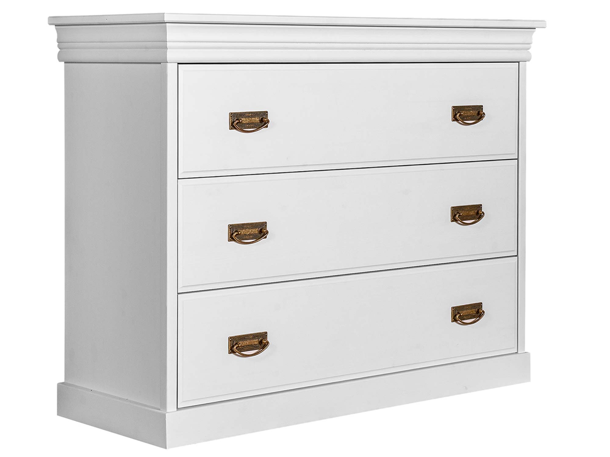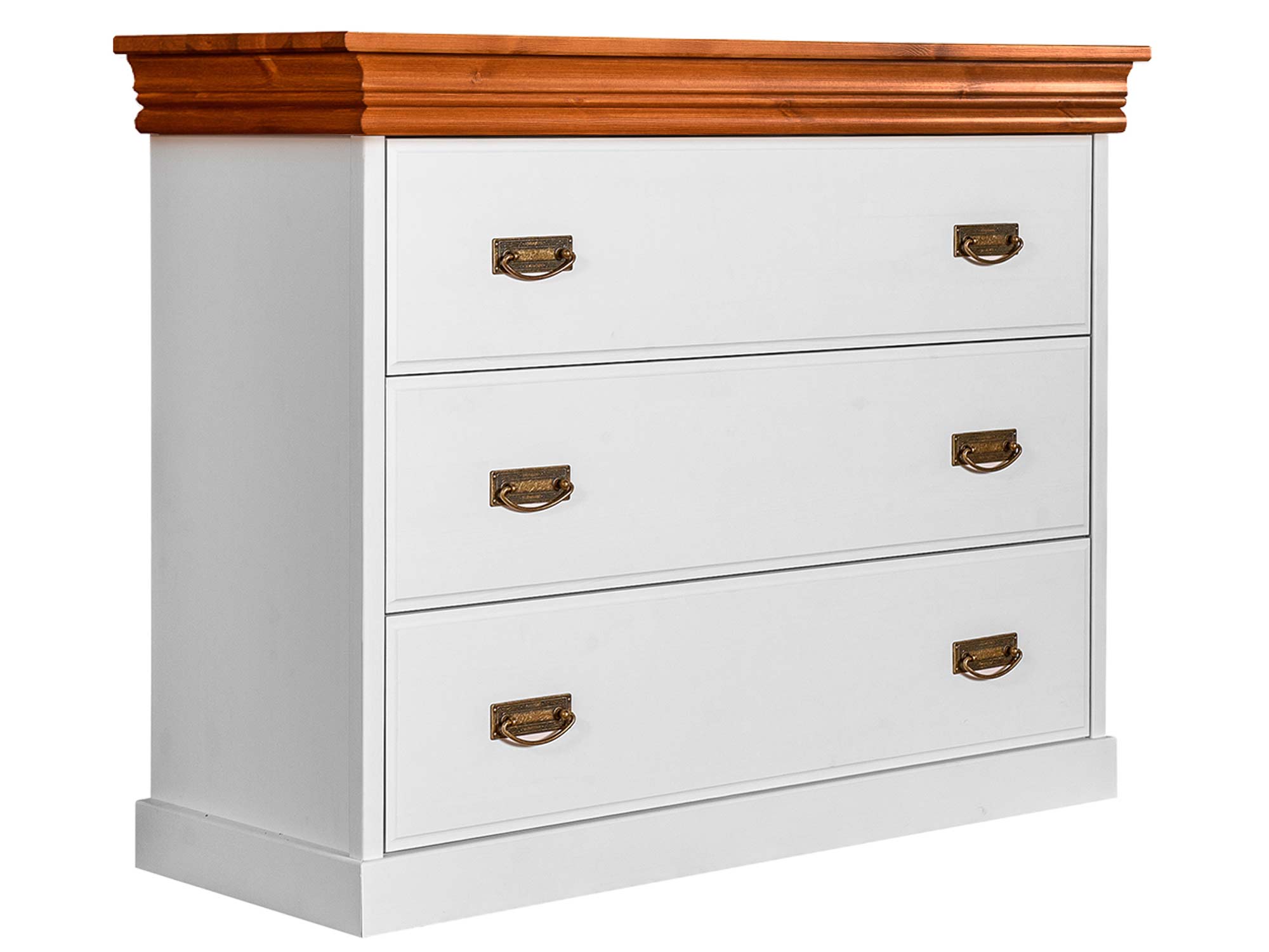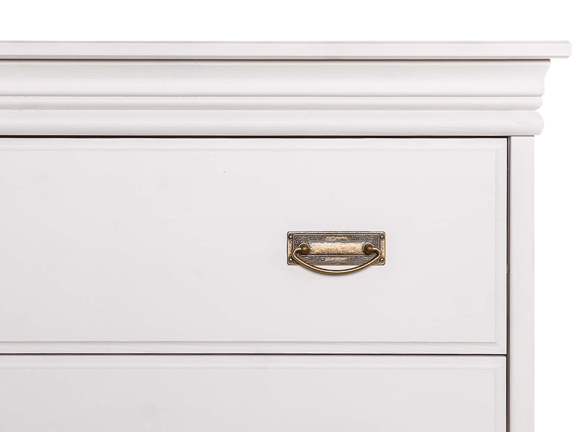 Co najistotniejsze, mała komoda ANADI z szufladami została wykonana z litego drewna sosnowego. Niewątpliwie gwarantuje to solidność wykonania i doskonałą trwałość. W połączeniu z ozdobnym cokołem, subtelnymi frezami na drzwiczkach i wieńcem na styl prowansalski, tworzy elegancki, schludny i ponadczasowy mebel na pokolenia. Co więcej dostępność kilku wybarwień pozwala na dopasowanie mebla do każdego wnętrza, znajdzie się wariant dla fanów klasyki i prostoty jak i nieszablonowości. Dodatkowo uchwyty stylizowane na stare złoto dodają meblu charakteru i unikatowości. Ponadto szuflady komody oparte są na prowadnicach z systemem cichego domyku, co umila użytkowanie i dodatkowo chroni mebel przed uszkodzeniami.