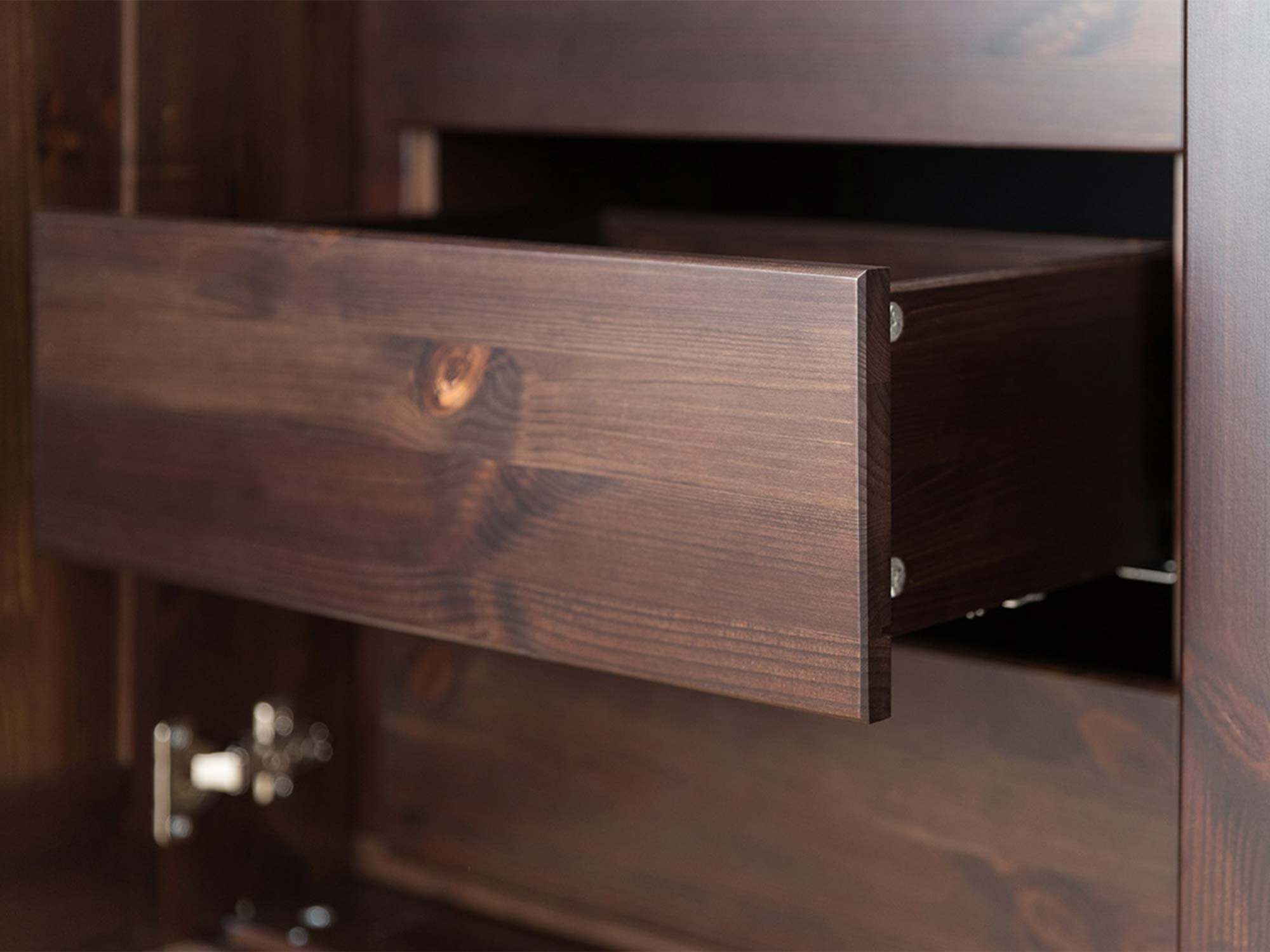 Detal otwartej szuflady drewnianej ciemnobrązowej z widoczną konstrukcją boczną