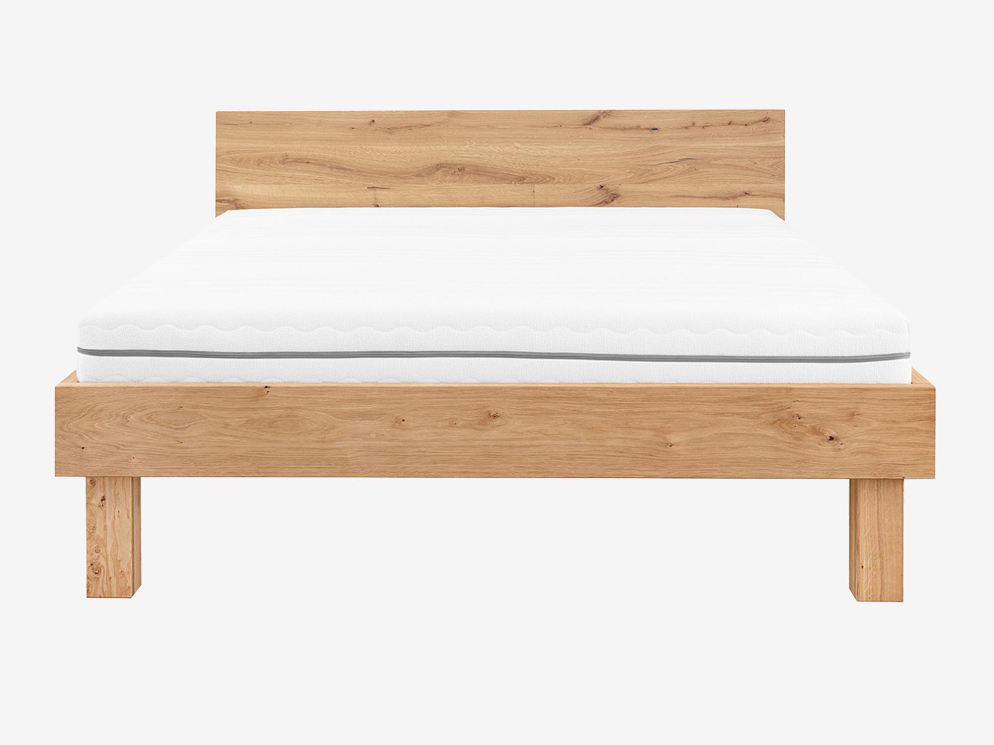 Dębowe łóżko z materacem i zagłówkiem drewnianym na masywnych nogach frontalny