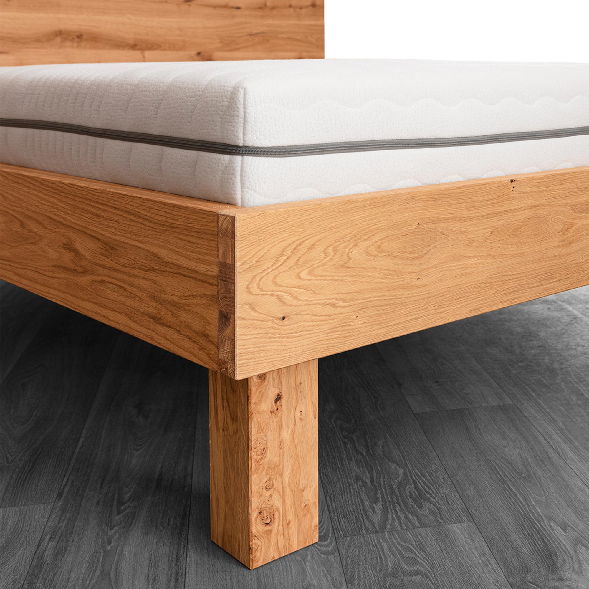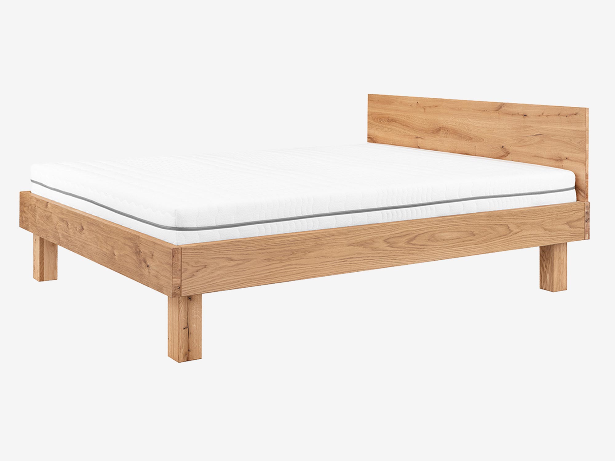 Łóżko dębowe z materacem i zagłówkiem drewnianym na masywnych nogach perspektywa