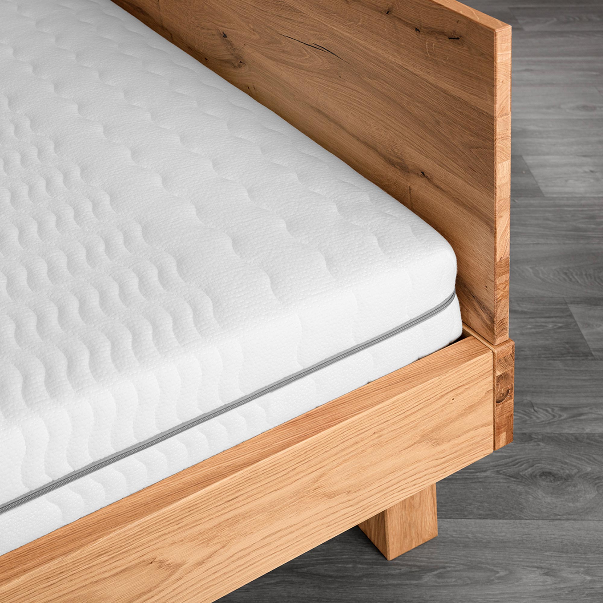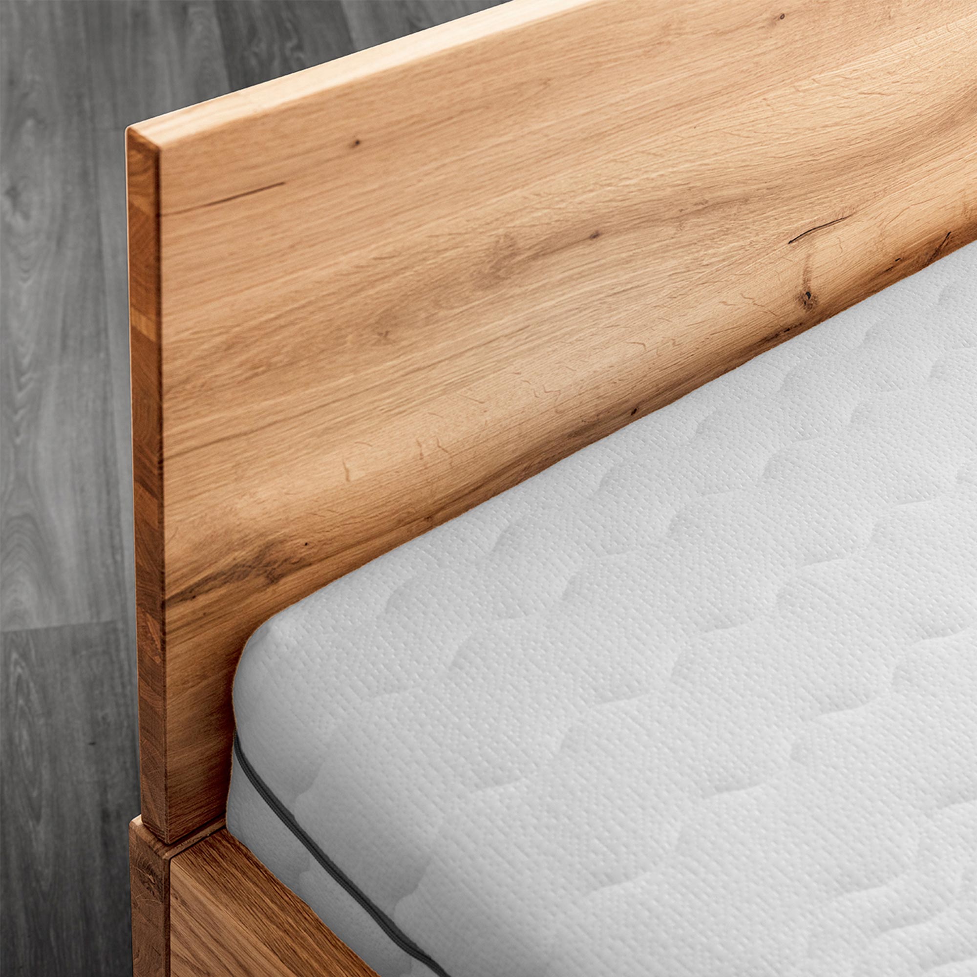 Detal zagłówka drewnianego łóżka dębowego i materaca usłojenie drewna zbliżenie