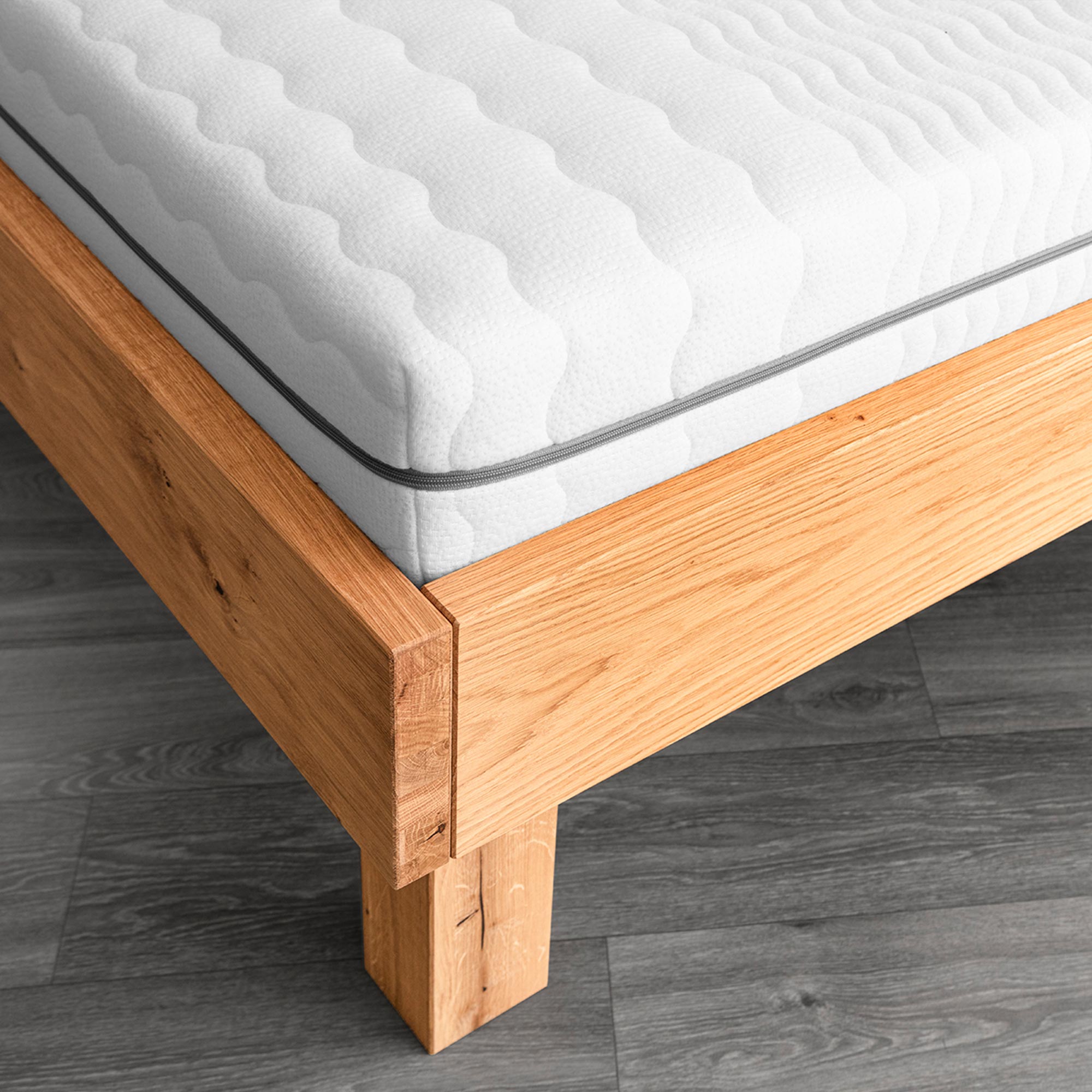 Łóżko dębowe detal narożnika ramy i masywnej nogi usłojenie drewna zbliżenie