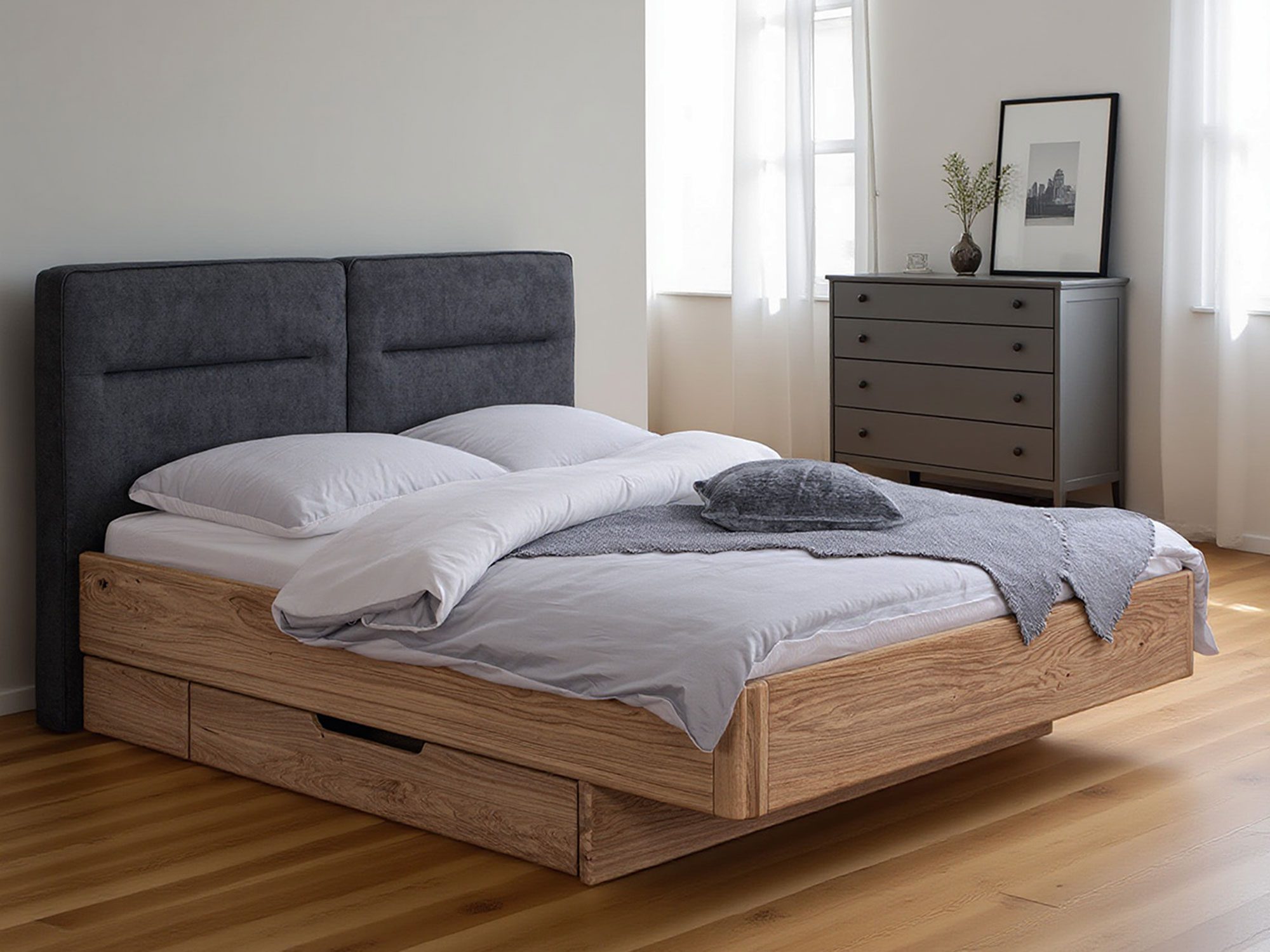 To nowoczesne łóżko dębowe z pojemnikiem to idealna propozycja dla osób ceniących harmonię i porządek w sypialni, łącząc naturalne piękno z funkcjonalnością. Mebel wykonany z litego dębu zachwyca unikalnym usłojeniem, które zostało podkreślone i zabezpieczone ekologicznym olejowoskiem. Solidne łóżka z tej kolekcji oferują nie tylko trwałość naturalnego surowca, ale także wygodę dzięki wysokiemu, tapicerowanemu zagłówkowi z tkaniny Enjoy. Praktyczne szuflady na prowadnicach kulkowych to sprytny sposób na przechowywanie pościeli bez zajmowania dodatkowego miejsca w szafie. Minimalistyczna forma z zaokrąglonymi krawędziami doskonale wpisuje się w styl skandynawski oraz japandi, tworząc przytulną atmosferę.